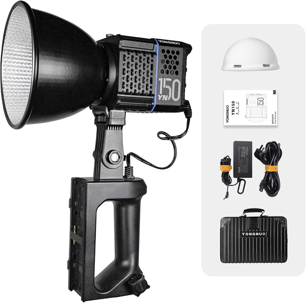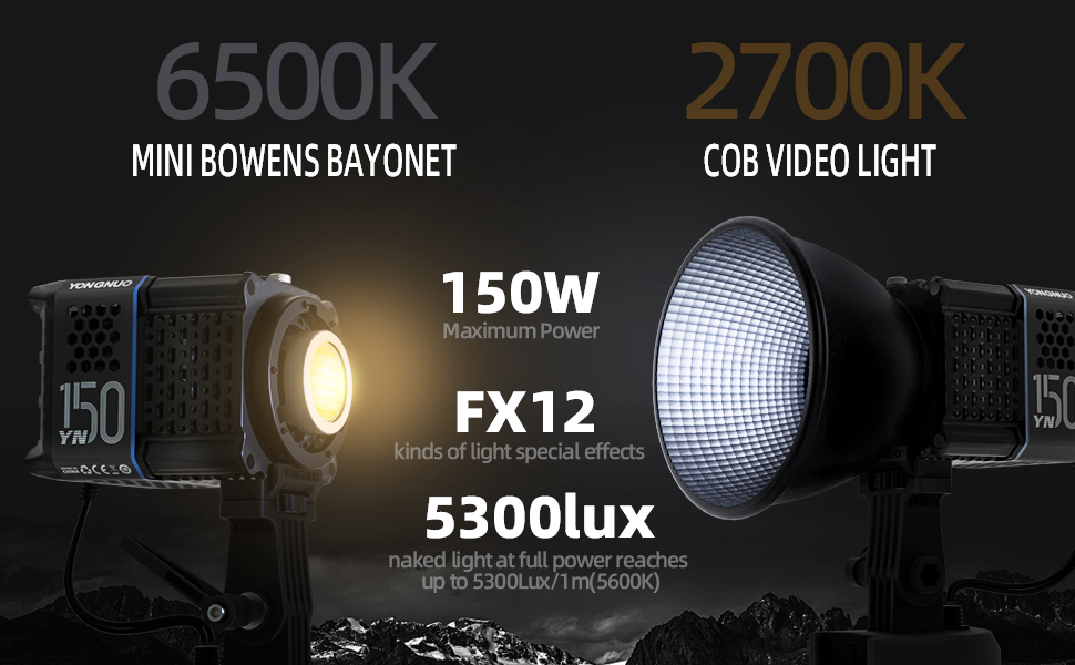 【طاقة خرج 150 وات 】YN150، طاقة ثابتة 150 وات، مصباح فيديو COB، تغيرات في درجة حرارة اللون، تبقى الطاقة دون تغيير، درجة حرارة اللون 2700-6500 كلفن، 18000 لومن@1 متر مع عاكس قياسي، RA≥95، 12 نوعًا من التأثيرات الخاصة الخفيفة.