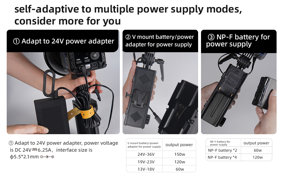 【 مصادر طاقة متعددة 】هناك ثلاثة أنواع من مخططات إمداد الطاقة، واحد هو محول طاقة 24 فولت، جهد الطاقة هو تيار مستمر 24 فولت 6.25 أمبير، حجم الواجهة حوالي 5.5*2.1 مم، والثاني هو محول طاقة مثبت على شكل حرف V لإمداد الطاقة، والأخير إحداها هي بطارية NP-F لإمدادات الطاقة.