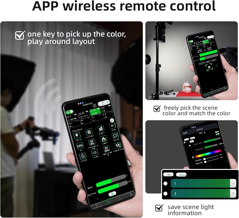 【 APP 2.4G جهاز تحكم عن بعد لاسلكي 】مفتاح واحد لالتقاط اللون، واللعب حول التصميم، واختيار لون المشهد بحرية ومطابقة اللون، وحفظ معلومات ضوء المشهد. وضع موسيقى التطبيق، يتحرك الضوء مع الصوت.