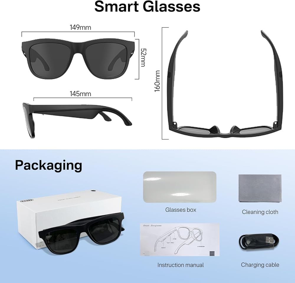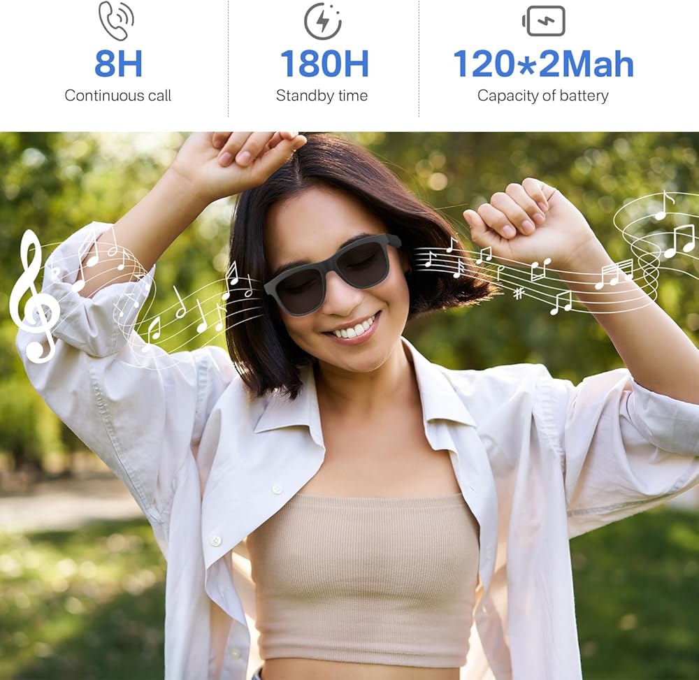 عمر بطارية طويل: تحتوي كل ساق نظارات شمسية صوتية ذكية على بطارية 120 مللي أمبير، مشحونة بالكامل خلال 1.5 ساعة ويمكن أن تدعم 8 ساعات من وقت التحدث و7 ساعات من وقت الموسيقى.
