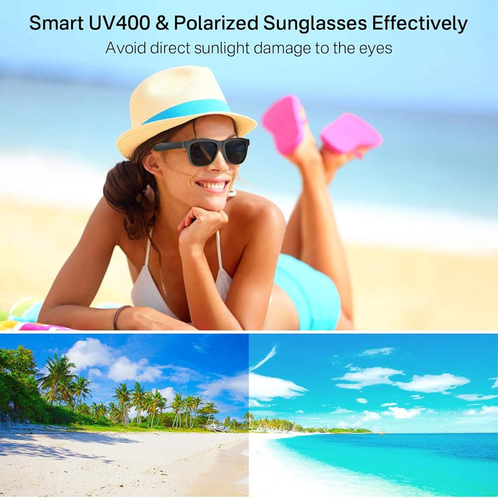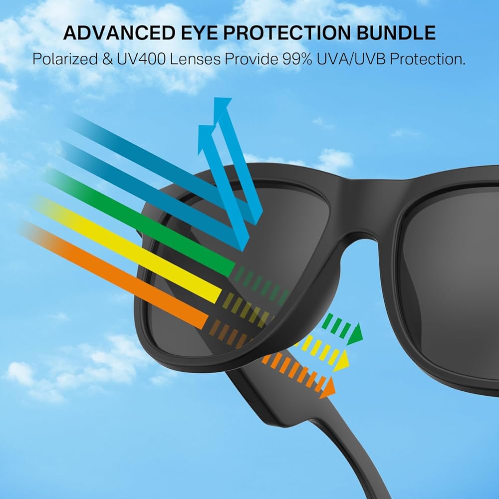 نظارات شمسية مستقطبة صوت بلوتوث ذكية للرجال والنساء - حماية من الأشعة فوق البنفسجية 400 وعمر بطارية طويل مع تصميم مفتوح للأذن، مساعد صوتي للموسيقى، الرد على المكالمات، القيادة، ركوب الدراجات، تسلق الجبال