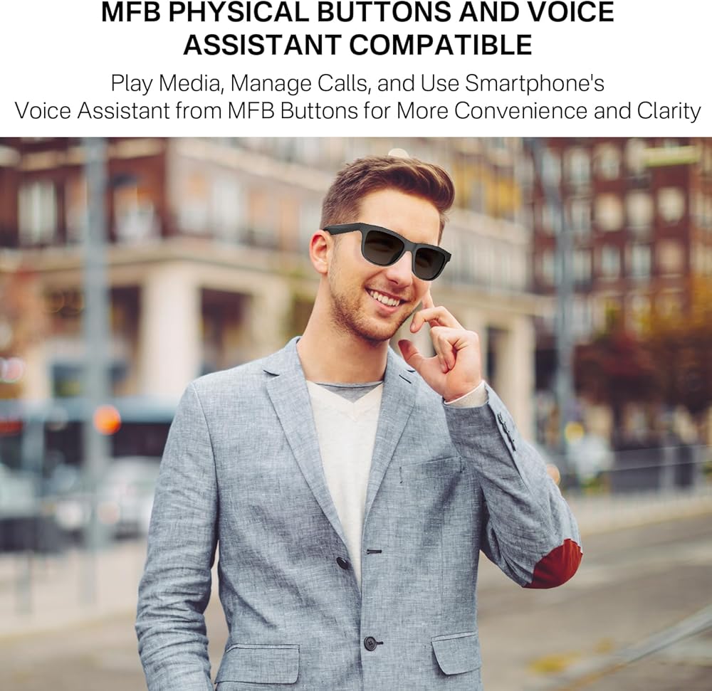 【التحكم الصوتي والتحكم في مستوى الصوت】مكبر صوت النظارات الشمسية مع تقنية المساعدة الذكية مثل الاتصال والرد على الهاتف بدون استخدام اليد، تحدث بسهولة Siri، Cortana، انقر نقرًا مزدوجًا على أزرار MFB اليمنى واليسرى لزيادة أو خفض مستوى الصوت