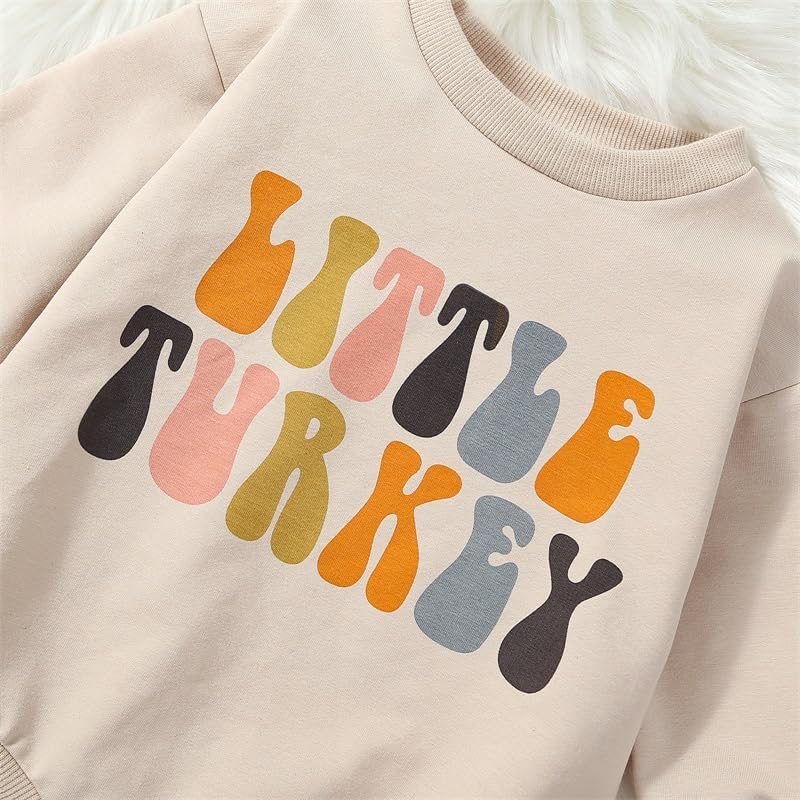 المزايا: سويت شيرت للفتيات الصغيرات لعيد الشكر الأول، طباعة حروف تركية صغيرة أمامية كرتونية، نمط ديك رومي خلفي، سويت شيرت خريفي بأكمام طويلة، رقبة دائرية، تصميم بإبزيم سفلي، سهل الارتداء والخلع، لطيف للغاية.
