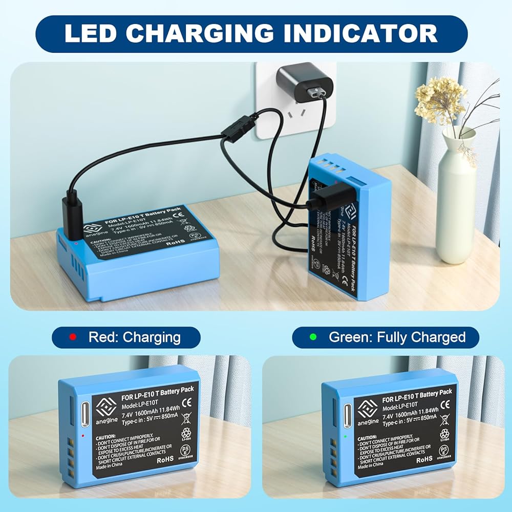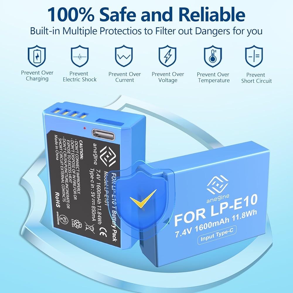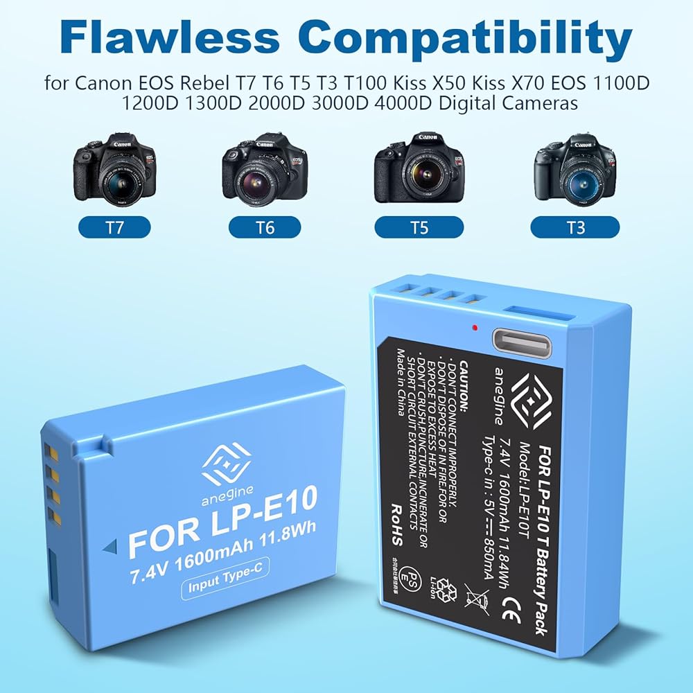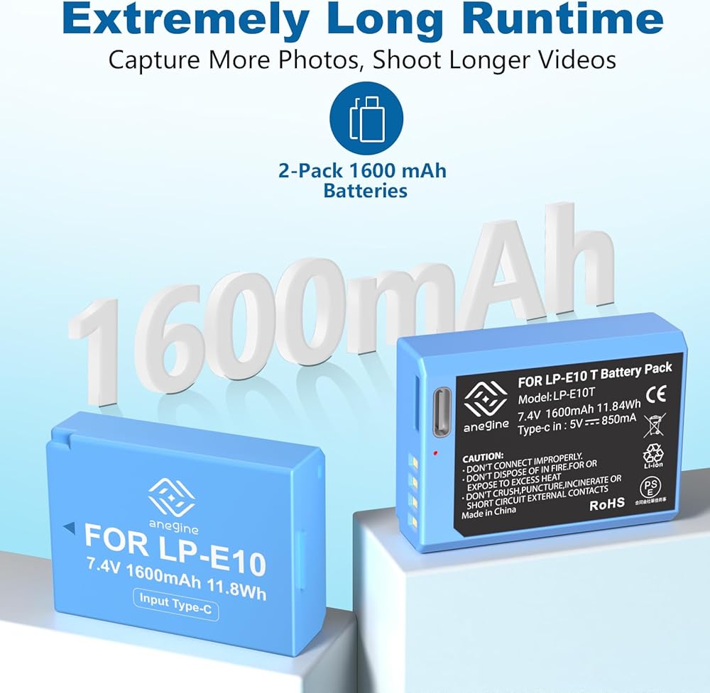 بطارية بديلة قوية وآمنة من Canon Rebel T7: تتمتع حزمة بطارية Anegine LP-E10 بسعة قوية تبلغ 1600 مللي أمبير في الساعة 7.4 فولت 11.8 وات في الساعة
