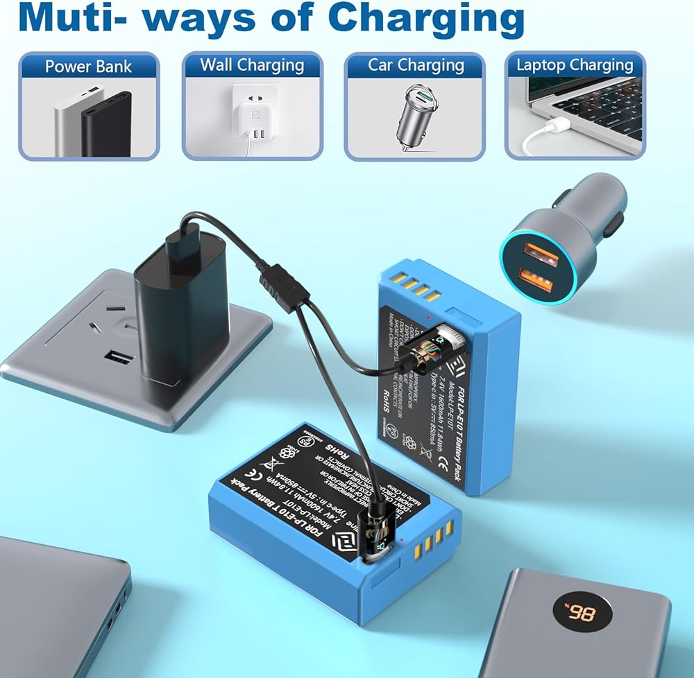 لا حاجة إلى شاحن: استمتع بتجربة الراحة المطلقة مع بطارية الشحن المباشر LP-E10. ما عليك سوى استخدام أي كابل شحن USB-C/Type-C (مثل تلك الخاصة بالهواتف المحمولة أو بنوك الطاقة) لشحن بطاريتين LP-E10 في وقت واحد