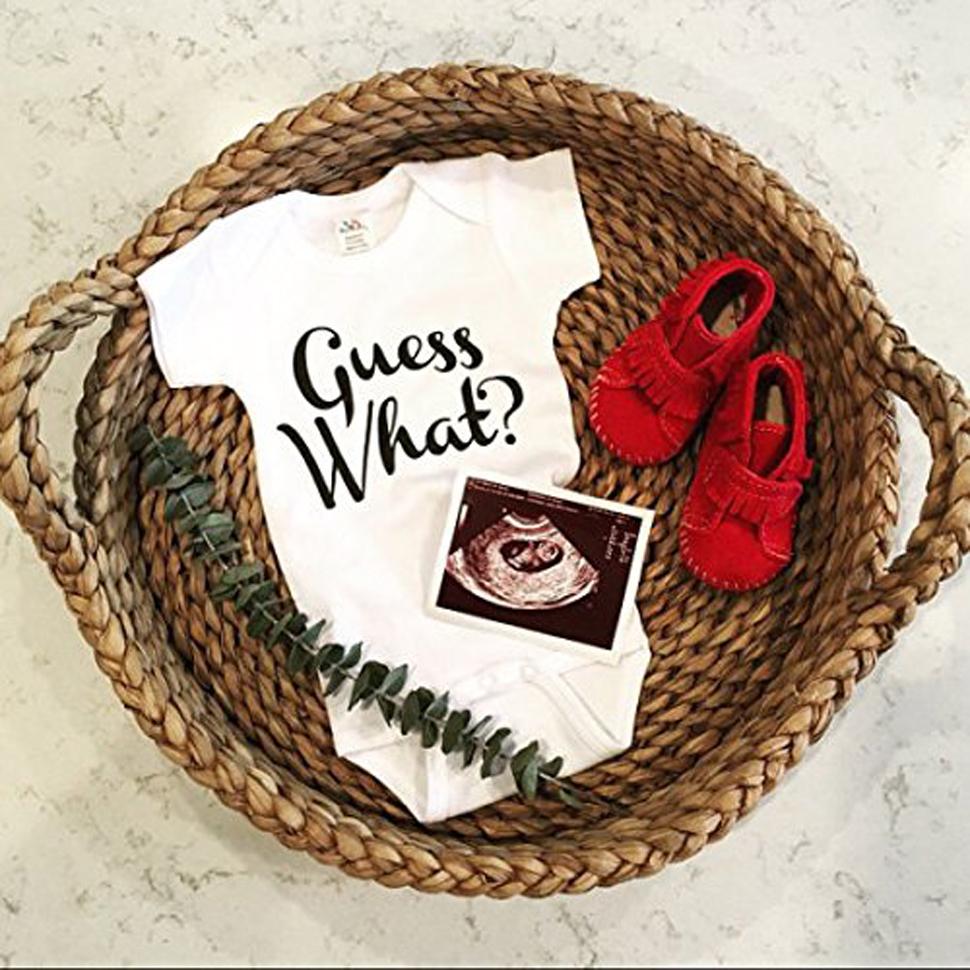هدية ذكية وممتعة [إعلان الحمل] لزوجك أو أجدادك أو كهدية لحفل استقبال المولود الجديد - خمن من؟ مطبوعة على قطعة واحدة قصيرة الأكمام جاهزة للاستخدام عند وصول الطفل
