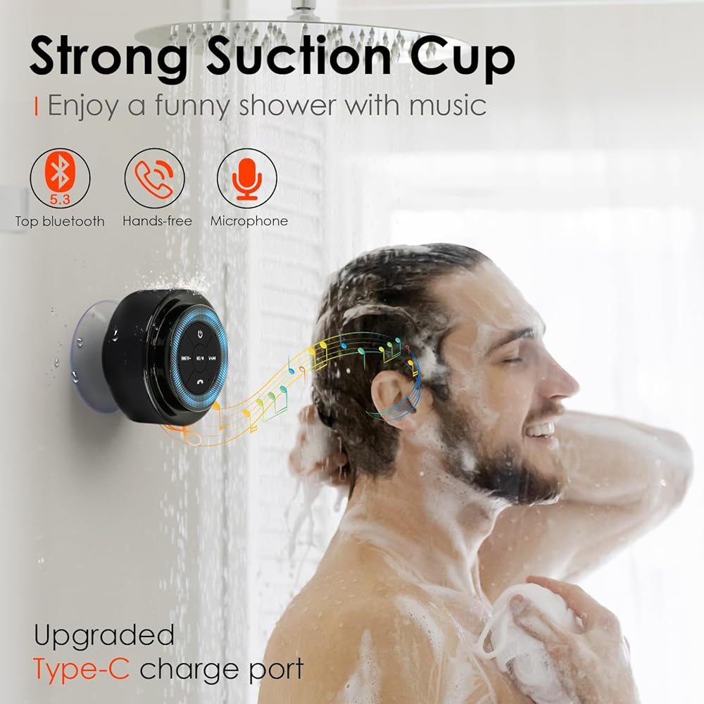 ♬【مقاومة للماء وعائمة معتمدة】سماعة بلوتوث الدش هذه تقاوم الماء والمطر والرذاذ، حتى أنها يمكن أن تطفو على حوض الاستحمام أو حمام السباحة، ويمكن غمرها بالكامل حتى 1 متر لمدة 30 دقيقة تحت الماء، مثالية للاستحمام في الحمام أو حمام السباحة أو التجديف بالكاياك. القوارب الخ