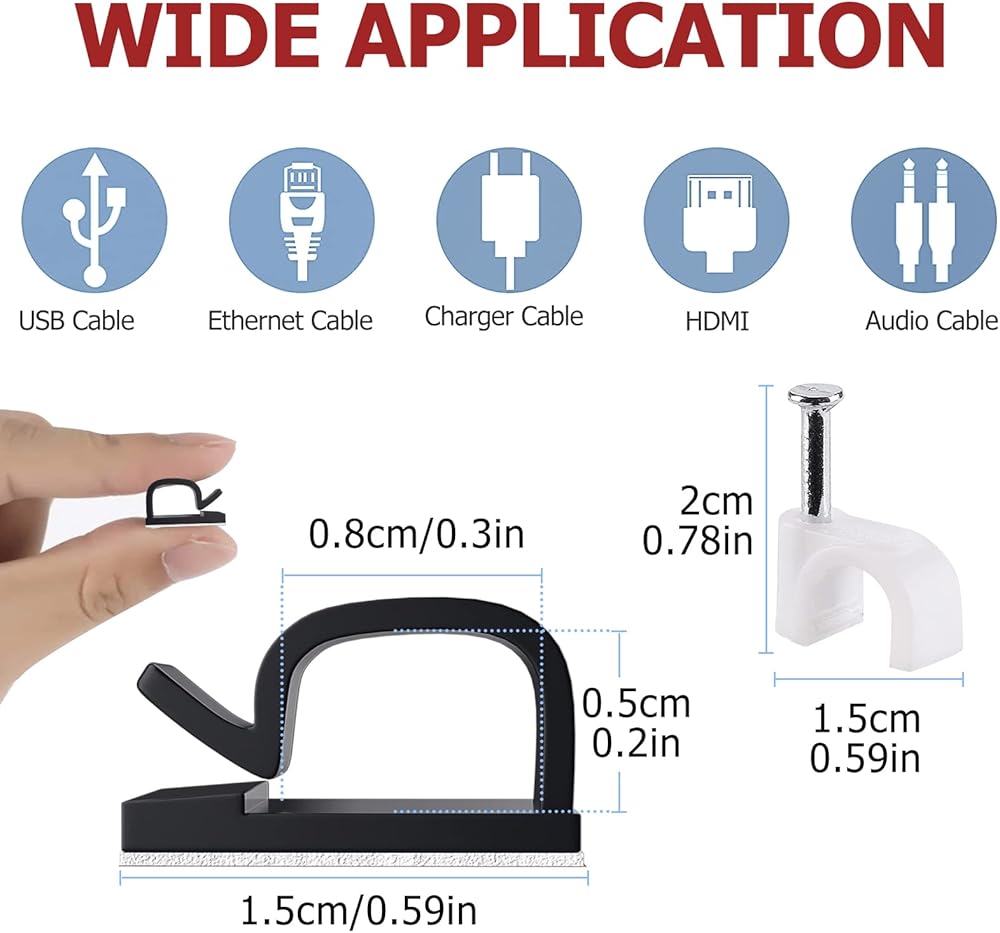 استخدام واسع - تعتبر مشابك الكابلات هذه رائعة لتنظيم الأسلاك، مثل كابل الشبكة، وكابل التلفزيون المحوري، وأسلاك USB، وشواحن الهاتف الخلوي، والإيثرنت، والأسلاك الكهربائية، وكاميرا أجهزة القياس في السيارة، والمنزل والمكتب. (قطر السلك في حدود 0.27 بوصة. /7 ملم)