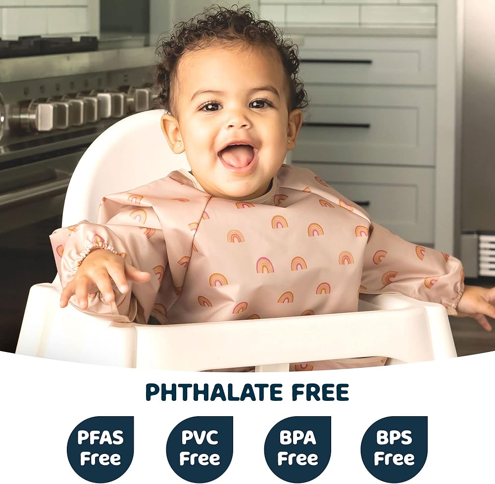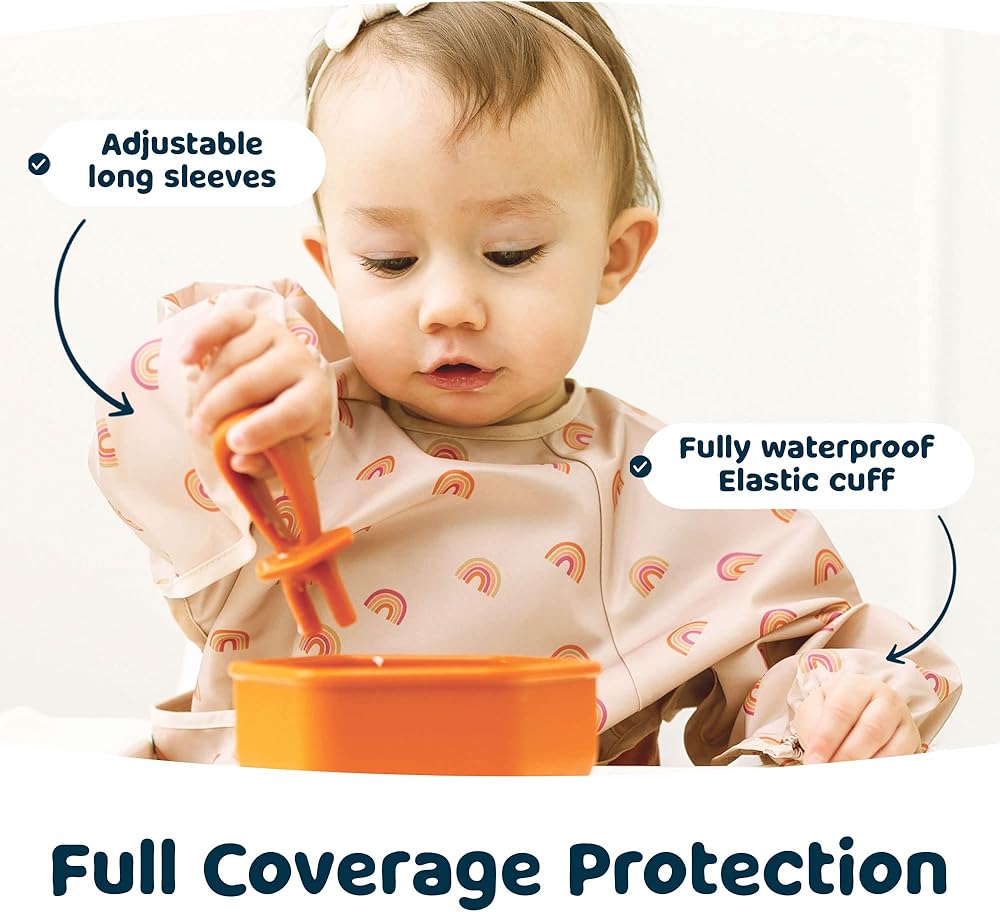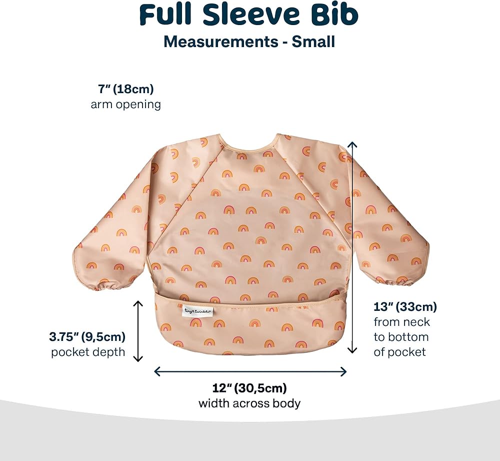 Tiny Twinkle is proud to offer you a waterproof sleeved bib made with soft, lightweight, water-repellent fabric from 100% recycled polyester