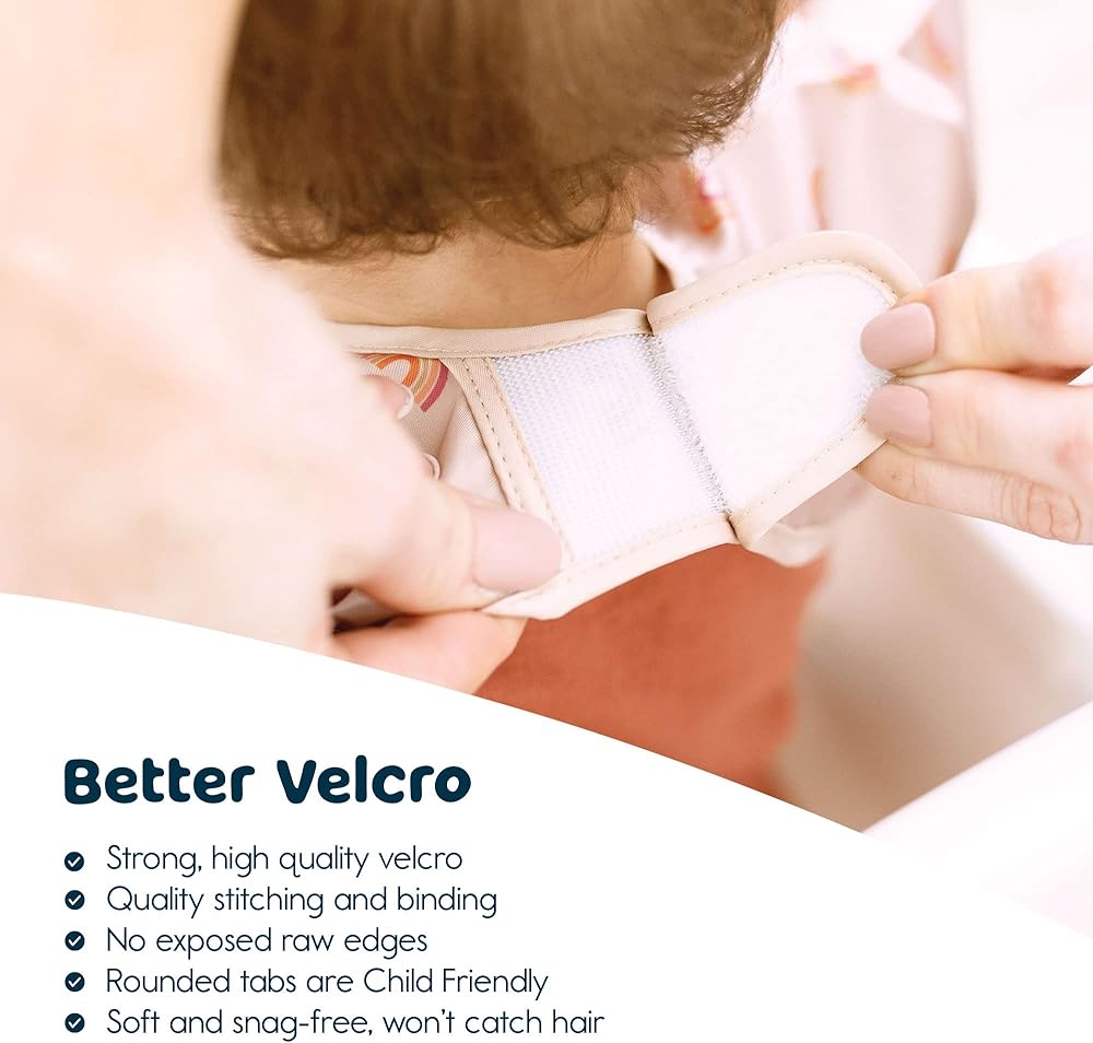 Bib features a tug proof closure that keeps the bib on when you want it and makes removal extra easy