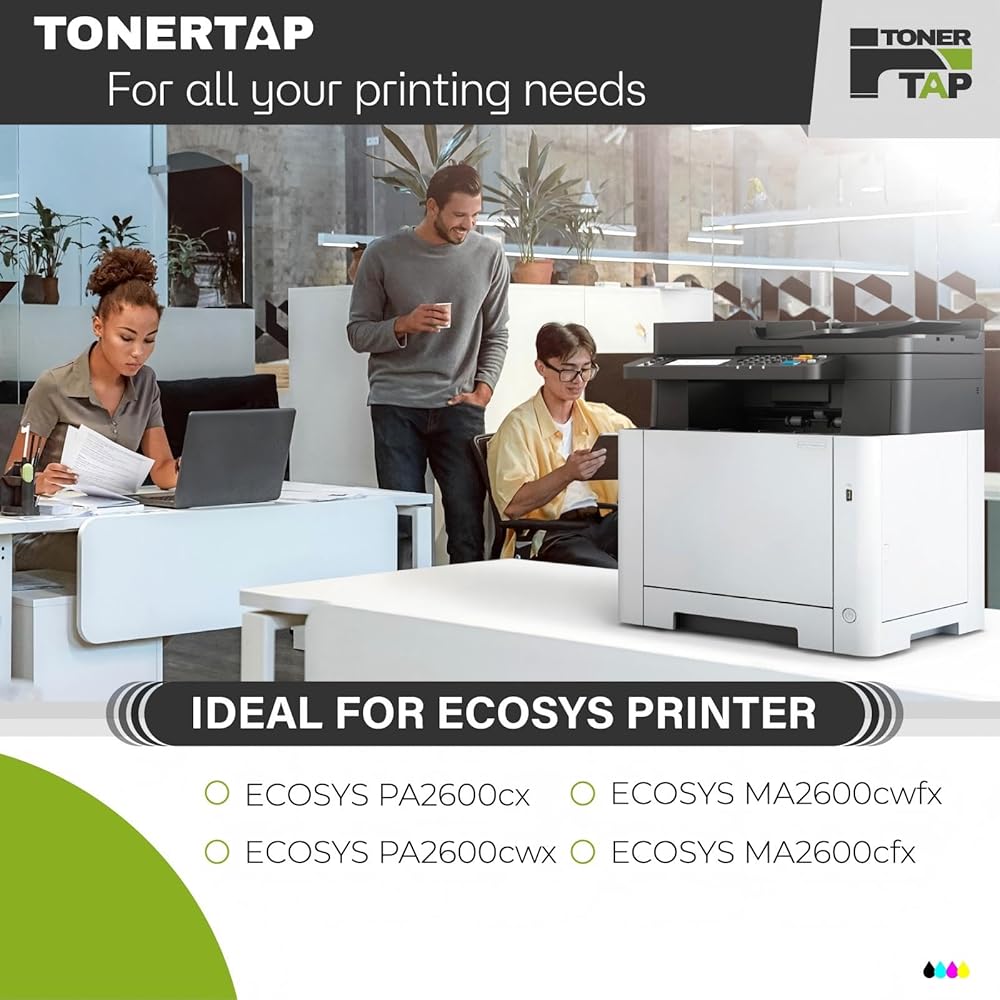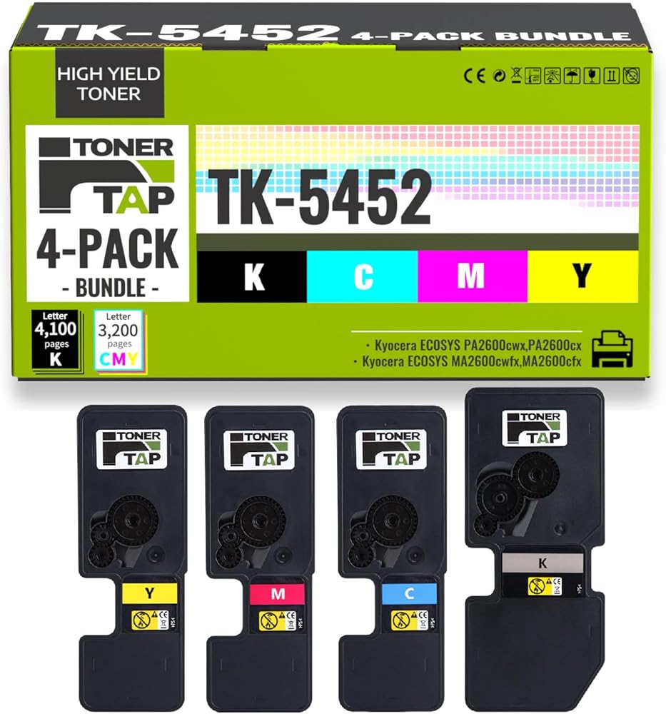 خراطيش حبر Toner Tap TK-5452K TK-5452C TK-5452M TK-5452Y 4 عبوات (أسود سماوي أرجواني أصفر) لـ ECOSYS PA2600cwx، PA2600cx، MA2600cwfx، MA2600cfx، استبدال عالي الإنتاجية