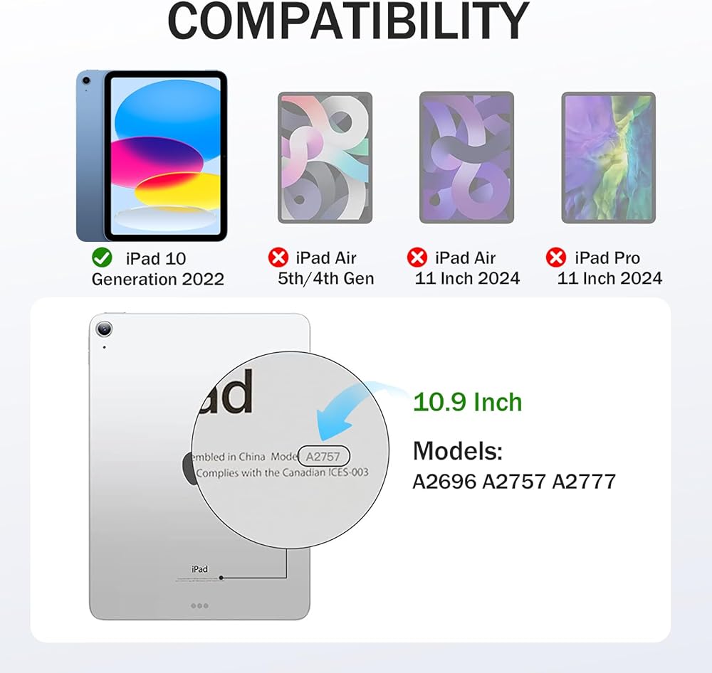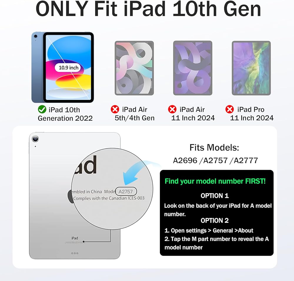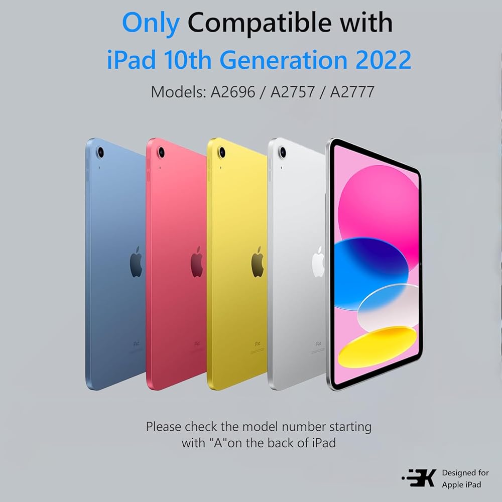【الطراز المتوافق: حافظات جديدة مصممة خصيصًا لجهاز iPad الجيل العاشر 10.9 بوصة تم إصدارها في عام 2022، تناسب الطرز فقط: A2696 / A2757 / A2777، يرجى التحقق من الجزء السفلي من جهاز iPad الخاص بك للعثور على رقم الطراز. نصائح: إنه غير متوافق مع أي أجهزة أخرى