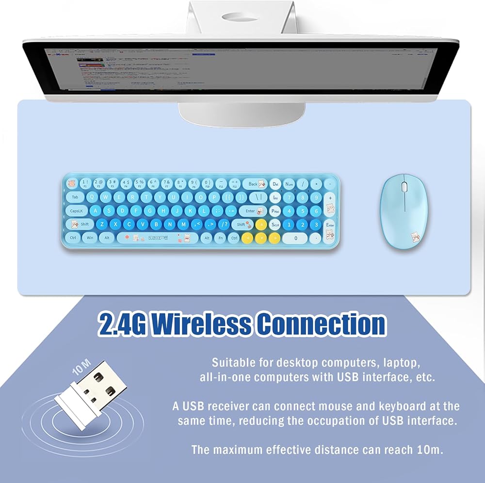 【Wireless connection】2.4G wireless transmission technology, the maximum transmission distance can reach 10m. The wireless connection solves the desktop clutter problem caused by the data cable, suitable for those who like to have a neat desktop. One USB receiver can connect the mouse and keyboard at the same time, reducing the occupation of the USB interface.