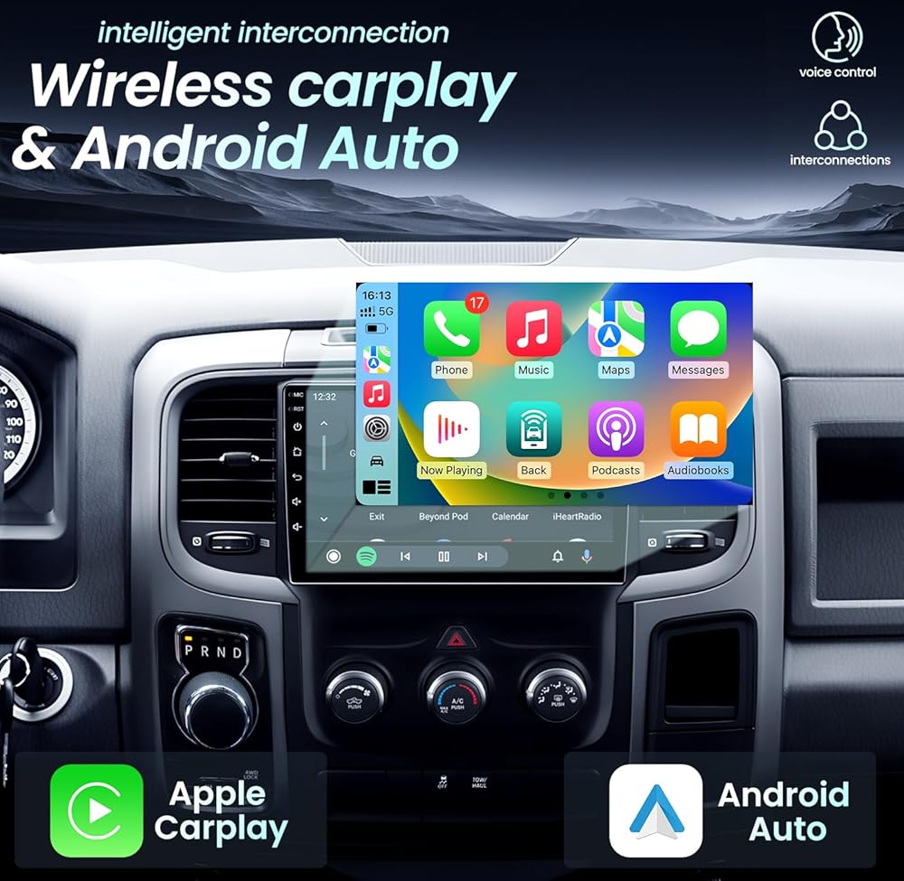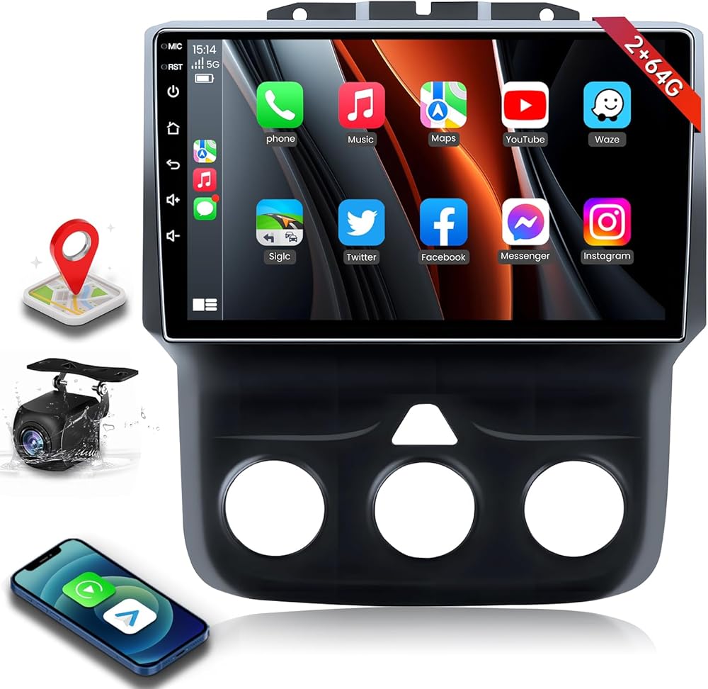 ستيريو راديو السيارة لدودج رام 1500 2500 3500 2013-2018 مع CarPlay اللاسلكي وAndroid Auto 2+64G استبدال الراديو 9 بوصة HD تعمل باللمس بلوتوث FM GPS (تناسب فقط التيار المتردد اليدوي)