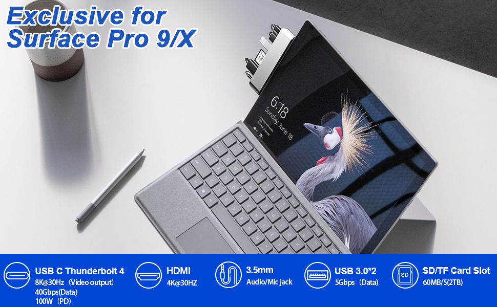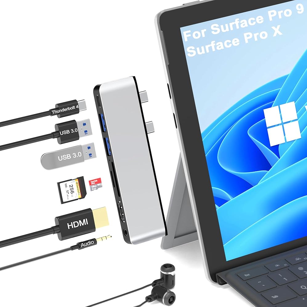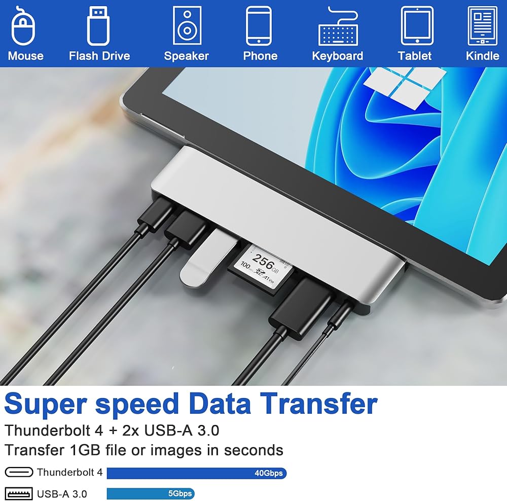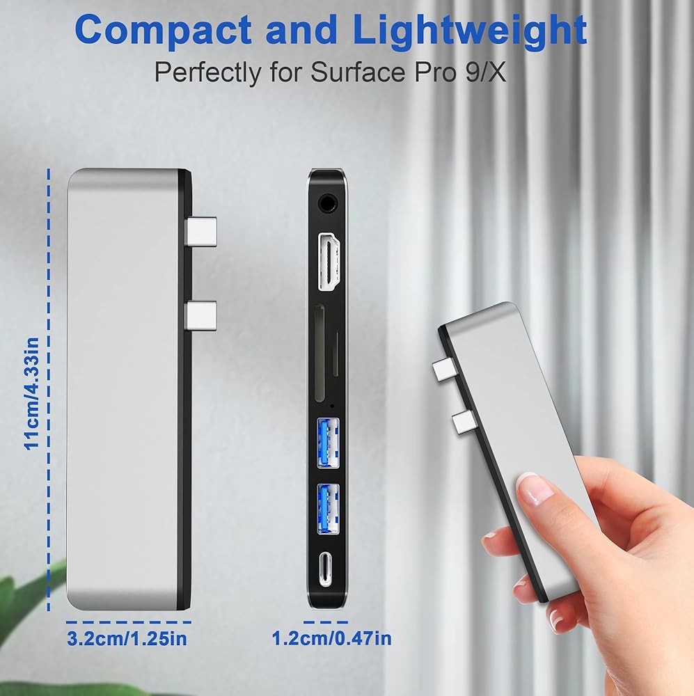 محطة إرساء لجهاز Surface Pro 9/10/11/X: مصممة خصيصًا لجهاز Microsoft Surface Pro 9/10/11/X، يحول هذا المحور منفذي USB-C إلى 7 منافذ: 1x 4K HDMI، 1x Thunderbolt 4 USB-C ( يدعم فيديو 8K@30 هرتز، ونقل البيانات بسرعة 40 جيجابت في الثانية، وشحن PD بقوة 100 وات)، ومنفذين USB 3.0، وقارئ بطاقة SD 1x، وقارئ بطاقة TF 1x، ومنفذ صوت 1x 3.5 مم. استمتع بوظيفة التوصيل والتشغيل دون الحاجة إلى برامج تشغيل، وكل ذلك موجود في علبة متينة من الألومنيوم لتبديد الحرارة بشكل مثالي. ملحوظة: قد لا يتناسب هذا المحور بشكل آمن إذا كان جهاز Surface Pro الخاص بك يحتوي على حافظة واقية.
