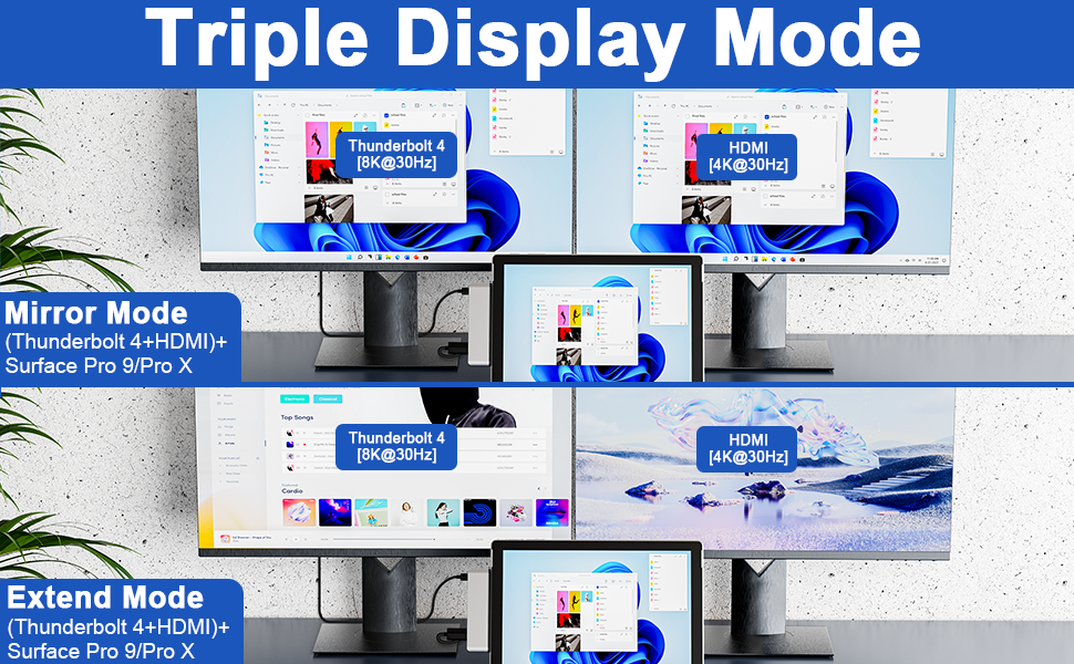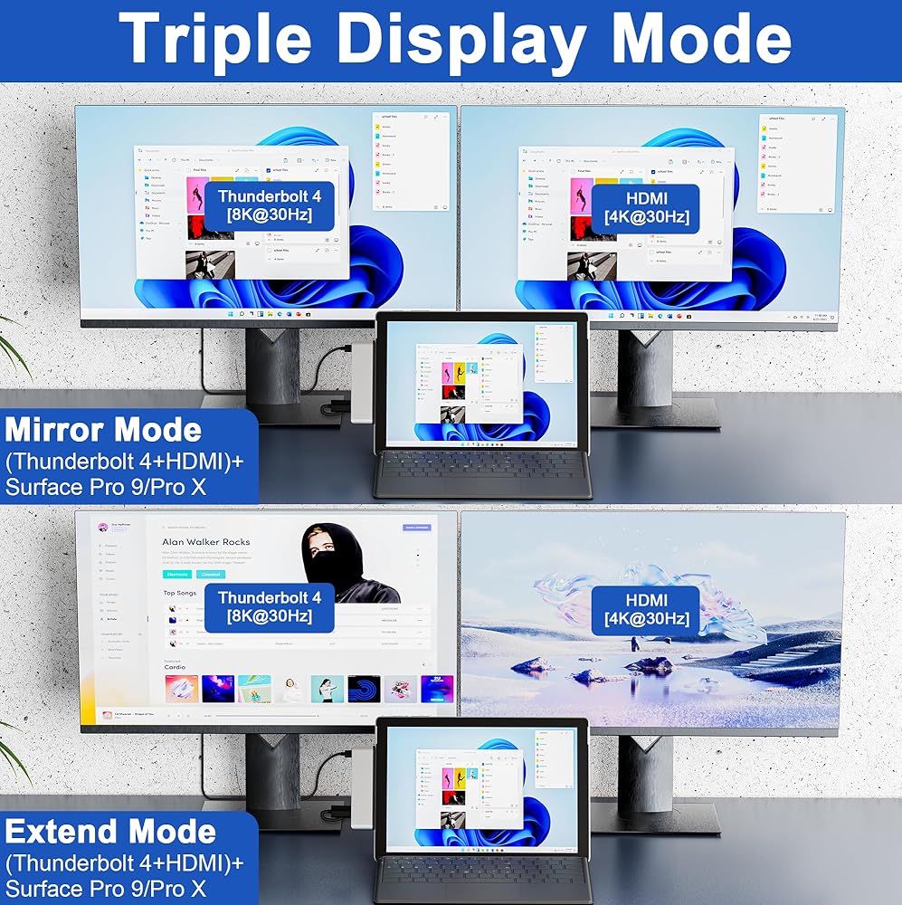 محطة إرساء وضع العرض الثلاثي Surface Pro 9: عزز إنتاجيتك من خلال محور العرض الثلاثي الخاص بنا لجهاز Surface Pro 9/10/11/X! قم بتوصيل شاشتين إضافيتين عبر 4K HDMI وUSB-C Thunderbolt 4، مما يدعم أوضاع التوسيع والمرآة. استمتع بمرئيات مذهلة مع HDMI حتى 4K عند 30 هرتز وUSB-C Thunderbolt 4 حتى 8K عند 30 هرتز. مثالي لمحرري الفيديو والمصورين والمبرمجين، حيث يمكنك تحويل مساحة العمل الخاصة بك وتنفيذ المهام المتعددة دون عناء!