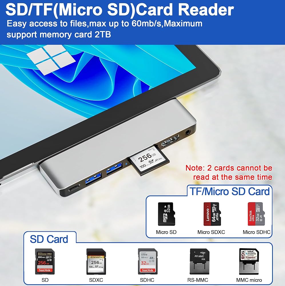 محول Surface Pro 9 مع نقل بيانات عالي السرعة: يدعم منفذ Type C Thunderbolt 4 سرعات نقل البيانات تصل إلى 40 جيجابت في الثانية، بينما يوفر منفذ USB 3.0 سرعات تصل إلى 5 جيجابت في الثانية. تتيح فتحة SD/TF (Micro SD) المدمجة إمكانية الوصول السريع إلى الملفات من بطاقات الذاكرة SD وTF بسرعات تصل إلى 480 ميجابت في الثانية. متوافق مع تنسيقات البطاقات المختلفة، بما في ذلك بطاقات SDXC، وSDHC، وSD، وMMC، وRS-MMC، وTF، وMicro-SDXC، وMicro-SD، وMicro-SDHC، وMini-SD، وUHS-I التي تصل سعتها إلى 2 تيرابايت، مما يسمح بالسرعة نقل الصور ومقاطع الفيديو والملفات. ملاحظة: لا يمكن قراءة بطاقات SD وTF في وقت واحد.