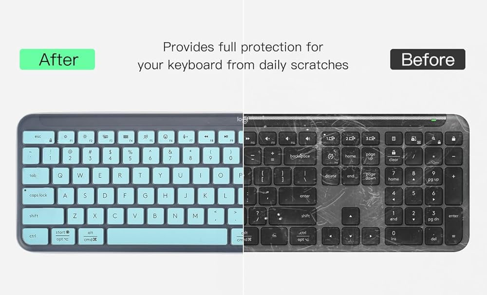 حماية كاملة للوحة المفاتيح: دقة عالية وتشكيل بخطوة واحدة، كل مفتاح ورمز مصبوبان بشكل فردي ومطبوعان خصيصًا على السيليكون للحصول على مظهر احترافي يدوم طويلاً، واقي لوحة المفاتيح Logitech MK955 K950 مناسب تمامًا لكل مفتاح مع حماية شاملة.