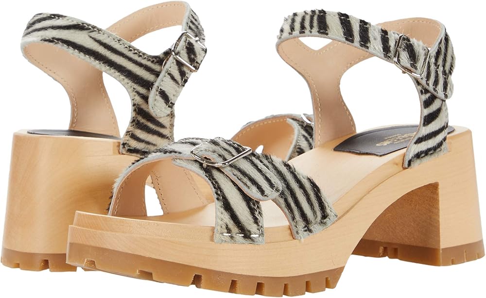 The Swedish Hasbeens Swedish Sandal blends classic 70's Swedish design with a retro 60's squared chunky heel. Dyed, real fur from cow originated from Italy. Leather or haircalf upper. Ankle strap buckle closure. Open round-toe silhouette. Leather lining and insole. Synthetic outsole. Wrapped heel.