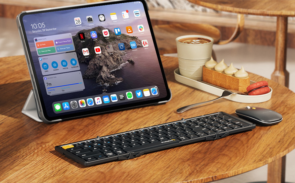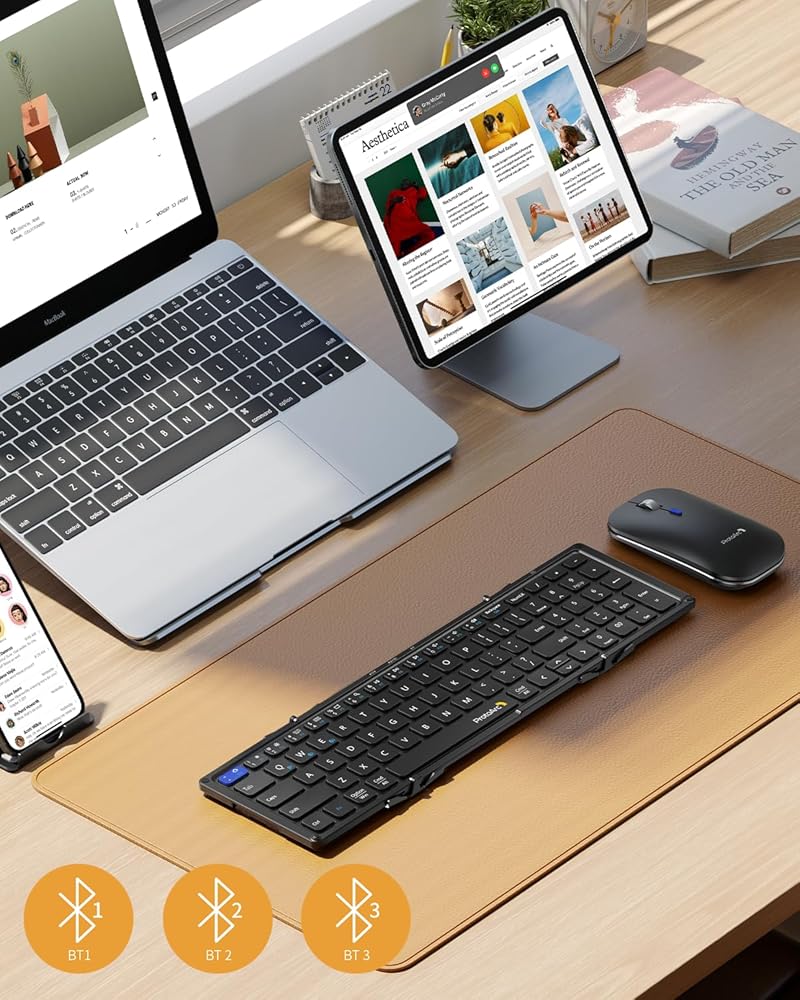 【لوحة مفاتيح بلوتوث متعددة الأجهزة】لوحة المفاتيح والفأرة المحمولة مع قنوات بلوتوث ثلاثية، والتي ستحافظ على اتصال مستقر واستجابة سريعة في نطاق تشغيل 33 قدمًا. يدعم ما يصل إلى 3 أجهزة مثل الهاتف الذكي أو الجهاز اللوحي أو سطح البخار أو الكمبيوتر المحمول.