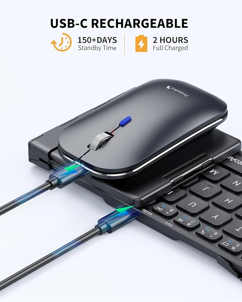 【قابلة لإعادة الشحن وتدوم طويلاً】بطارية مدمجة قابلة لإعادة الشحن، يمكن إعادة شحن كل من لوحة مفاتيح السفر والماوس عبر كابل نوع C المتضمن، مما يوفر 48 ساعة من التشغيل أو أكثر من 150 يومًا من وقت الاستعداد بعد شحن 2-3 ساعات. يدوم لفترة طويلة بما يكفي لرحلة عملك أو إجازتك.