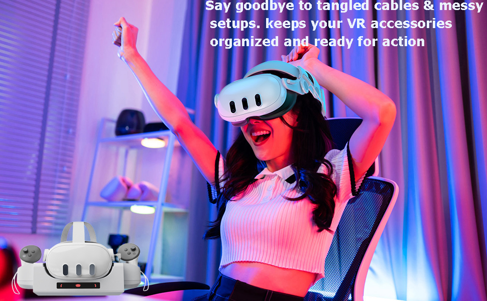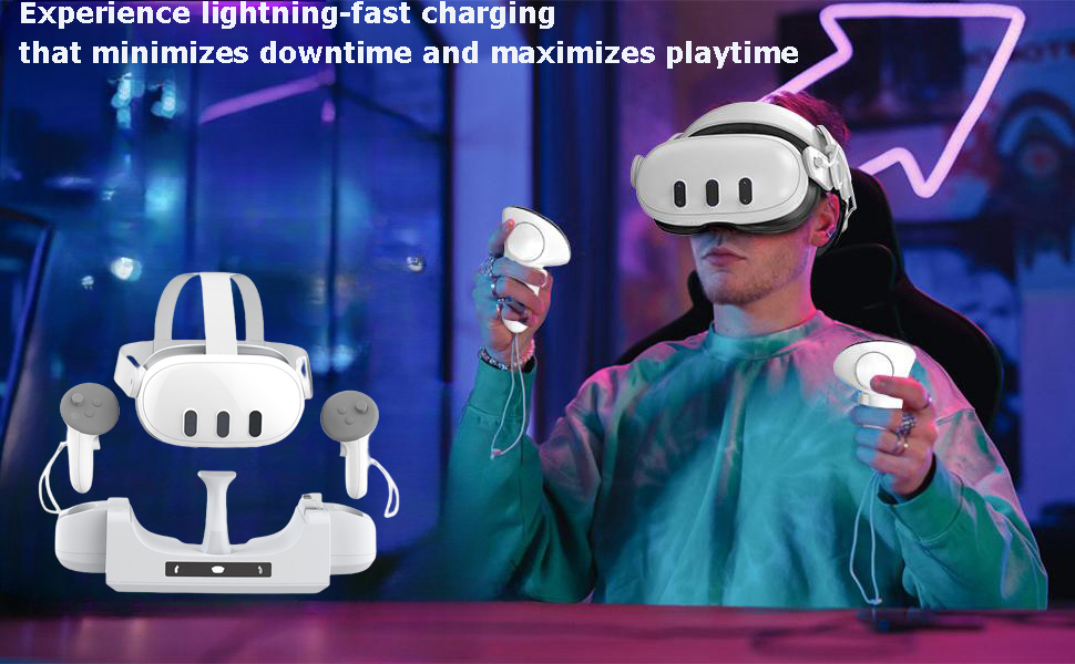 قاعدة شحن قابلة للدوران 180 درجة: تم تصميم قاعدة الشحن بقاعدة شحن قابلة للدوران 180 درجة، مما يسمح لك بسهولة العثور على الزاوية المثالية لشحن سماعة الواقع الافتراضي الخاصة بك.