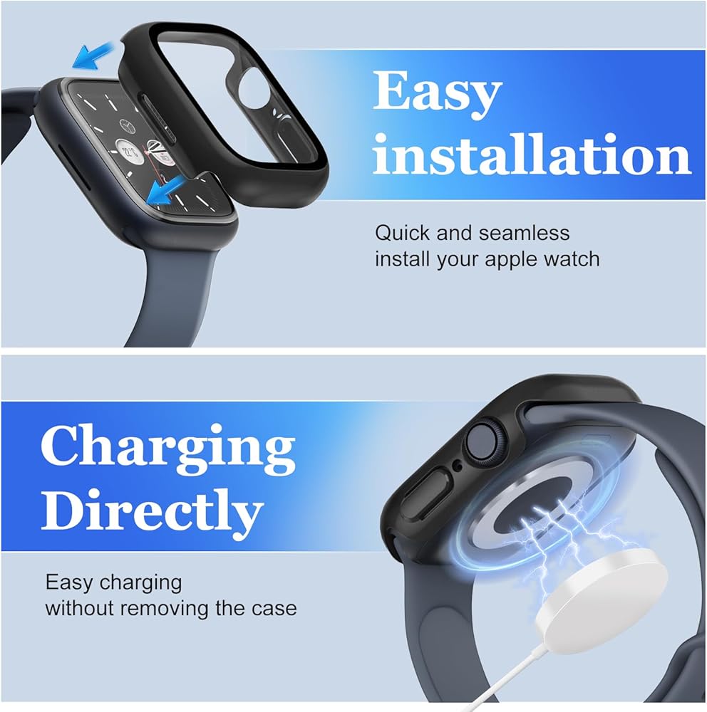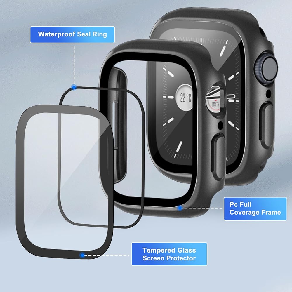 • الحماية الكاملة: إطارات منتجاتنا مصنوعة من مواد الكمبيوتر المتينة التي توفر تغطية شاملة وحماية ضد الخدوش والصدمات والتآكل اليومي. يضيف واقي الشاشة الزجاجي ذو الصلابة 9H طبقة إضافية من الدفاع إلى الساعة، مما يضمن أن iWatch الخاص بك آمن وموثوق به