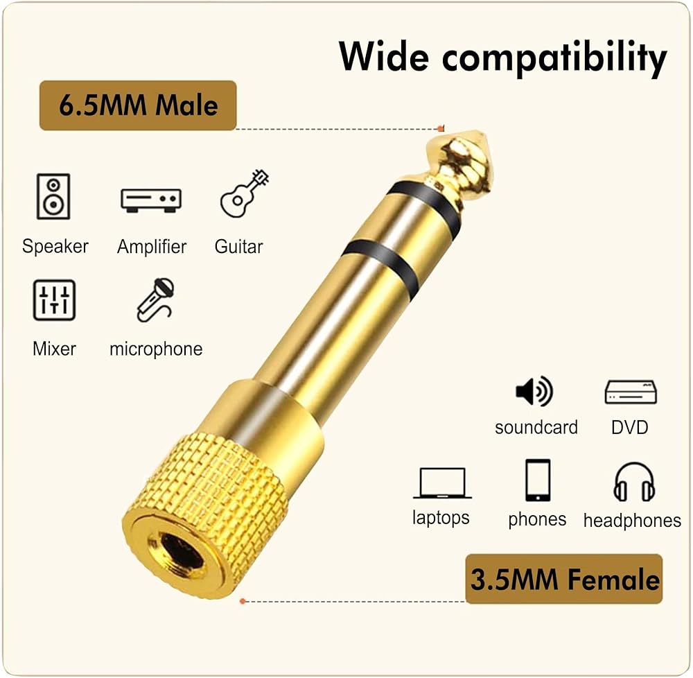 محول سماعة الرأس 6.35 مم إلى 3.5 مم: يناسب جميع الأجهزة بمقبس 6.35 مم، ولوحات المفاتيح الإلكترونية، والبيانو الرقمي، والقيثارات، والمسارح المنزلية، ومكبرات الصوت، ومكبرات الصوت الجهير، ومسجلات الأشرطة، والخلاطات، وما إلى ذلك. متوافق. طرف 3.5 ملم يناسب جميع الأجهزة بمقبس 3.5 ملم