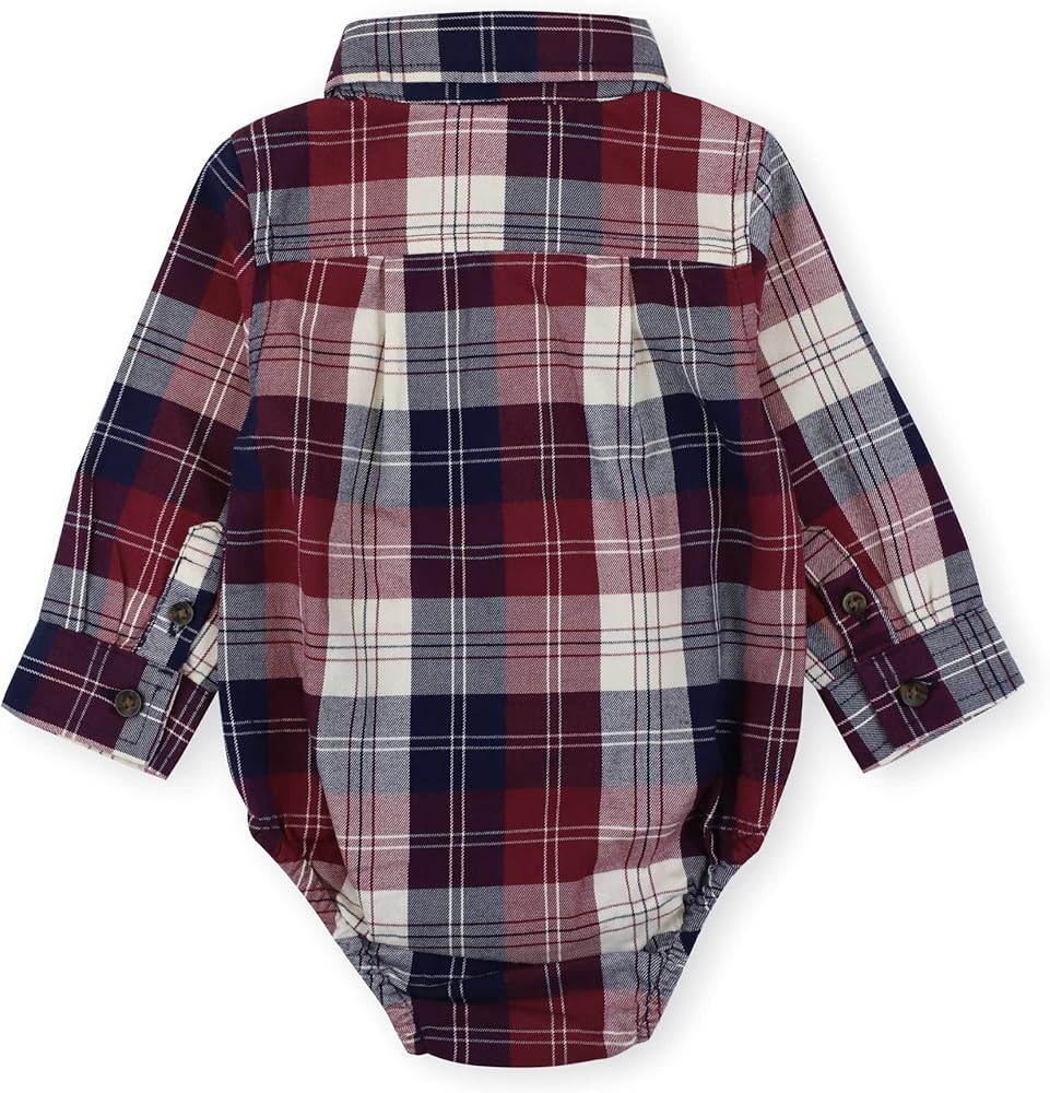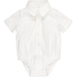 Button closure at back neck and concealed ring snaps at inseam for easy diaper changes. Soft white woven collar.