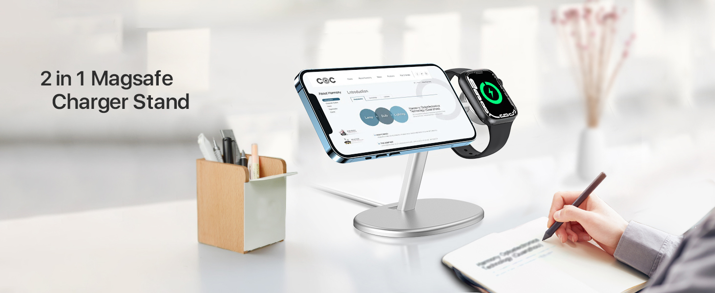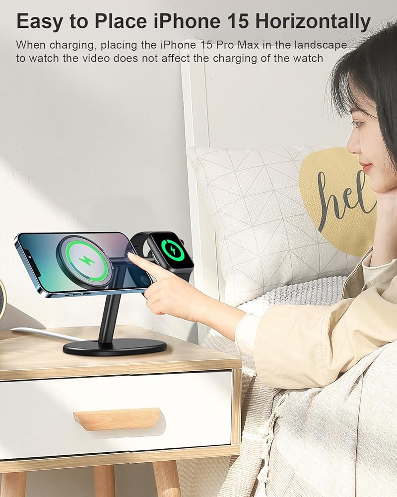 【تجربة مريحة】يوفر حامل الشاحن 2 في 1 المصمم حديثًا من EWA لـ Magsafe استنادًا إلى بيئة العمل تجربة زاوية المشاهدة الأكثر راحة. يمكنك إجراء مكالمات FaceTime ومشاهدة مقاطع الفيديو وما إلى ذلك. عند شحن iPhone 15 Pro Max في الوضع الطبيعي، هناك مساحة كافية لشحن Apple Watch على الجانب الآخر ولا يتأثر على الإطلاق.