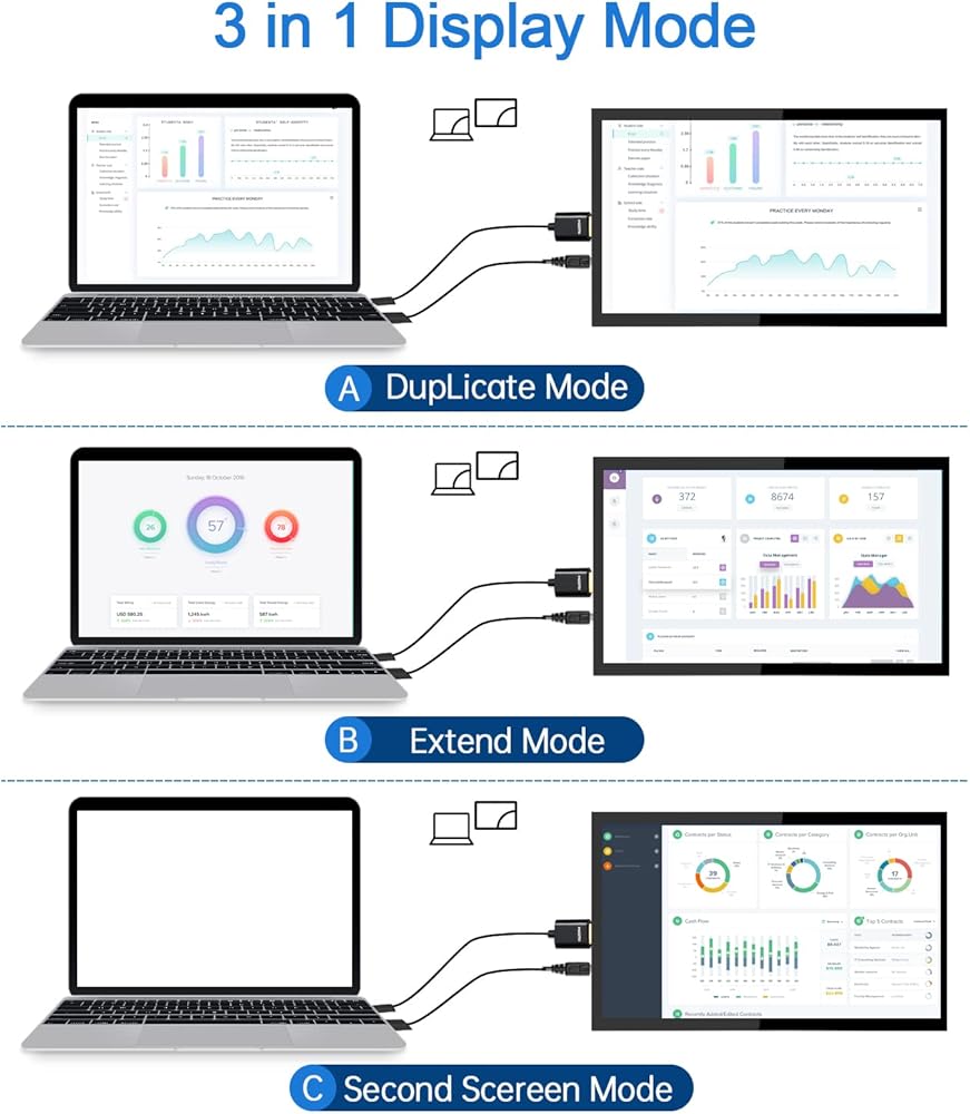 • ثلاثة أوضاع تطبيق للكمبيوتر المحمول - الوضع المكرر، ووضع التمديد، ووضع الشاشة الثانية. كل وضع له تأثيرات استخدام مختلفة، مما يوفر الراحة والترفيه لعملك وحياتك. انقر بزر الماوس الأيمن فوق إعدادات العرض على سطح مكتب الكمبيوتر المحمول الخاص بك، ثم حدد ثلاثة أوضاع استخدام مختلفة في شريط إعدادات العرض المتعدد وفقًا لاحتياجاتك. يرجى ملاحظة: هذه الشاشة لا تدعم جميع طرازات Macbook.