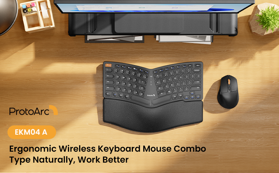 ProtoArc EKM04 مجموعة لوحة مفاتيح وماوس لاسلكية مريحة، لوحة مفاتيح مدمجة، ماوس لاسلكي قابل لإعادة الشحن مع 4 نقاط لكل بوصة قابلة للتعديل، تصميم منفصل، مسند للمعصم، مستقبل USB 2.4 جيجا هرتز، للنوافذ
