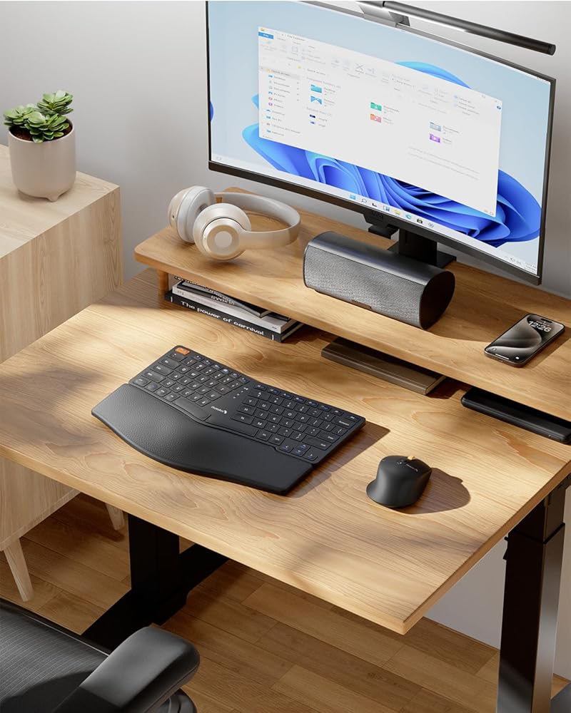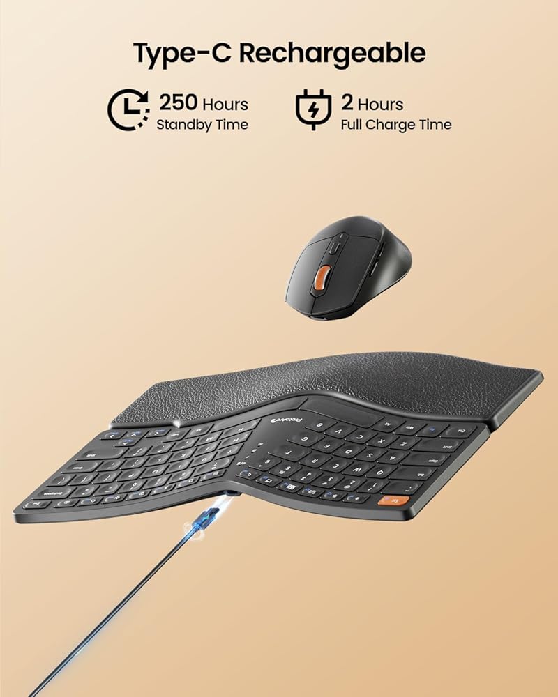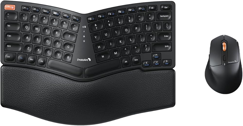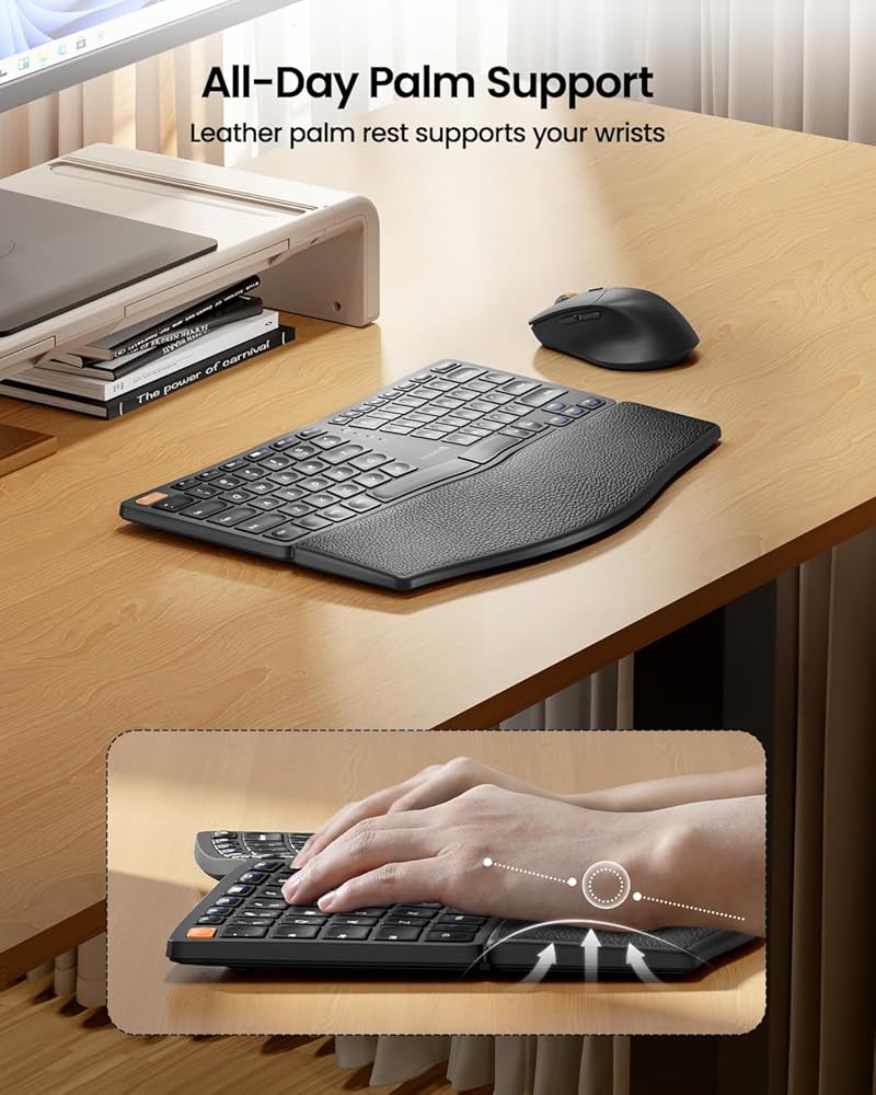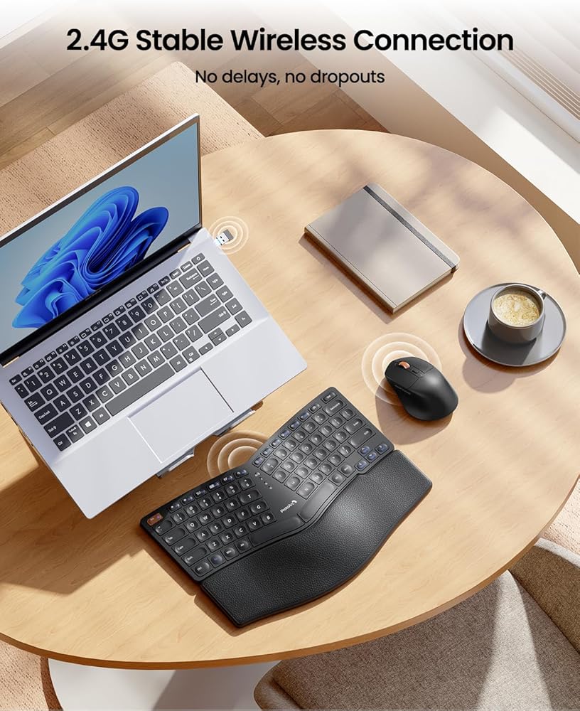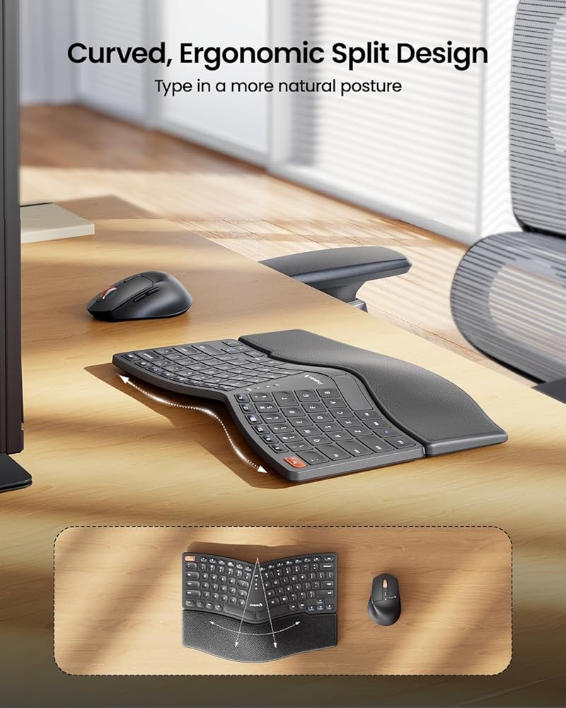 لوحة مفاتيح وماوس مريحان: لوحة مفاتيح مقسمة مريحة مقترنة بماوس مريح، تساعد على وضع يديك بشكل صحيح عند الكتابة، مما يوفر من إجهاد معصمك