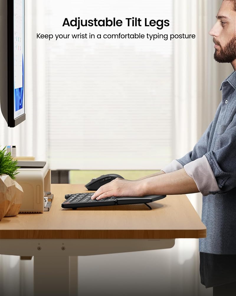 دعم راحة اليد طوال اليوم: يوفر مسند المعصم المنحني مع السطح الجلدي راحة في الكتابة مع دعم أكبر للمعصم، وانحناء أقل للمعصم مقارنة بلوحة المفاتيح القياسية بدون مسند للمعصم. تعمل أرجل الإمالة القابلة للتعديل على وضع لوحة المفاتيح بزاوية مثالية للحفاظ على استرخاء معصمك وراحته أثناء الكتابة أثناء الوقوف.