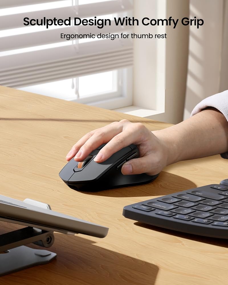 ماوس لاسلكي مريح: ماوس لاسلكي مريح مع مسند للإبهام يساعد على منع أعراض مؤشر القوة النسبية (RSI) ويعزز راحة أكبر من الماوس التقليدي. 4 مستويات DPI (800/1200/1600/2400 DPI) لضبط حساسية المؤشر بسهولة.