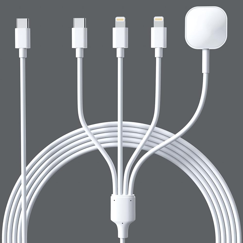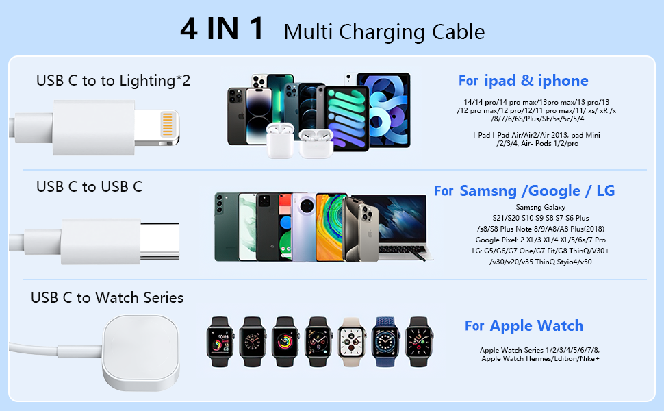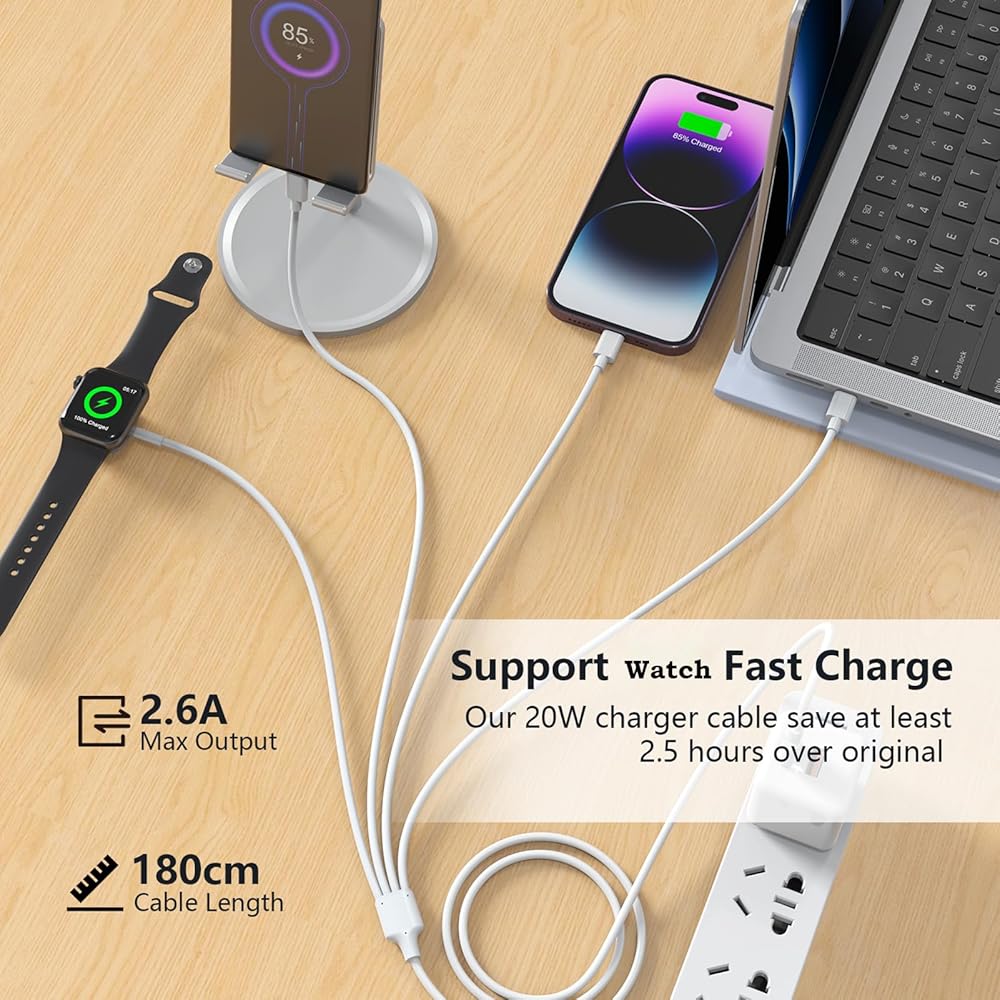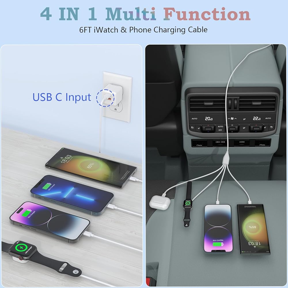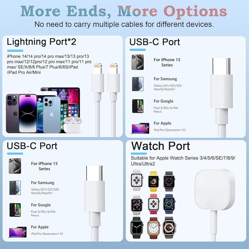 ⌚【الراحة القصوى للمسافرين 】 كابل الشاحن المتعدد 4 في 1 الخاص بنا هو مغير قواعد اللعبة! مع Lightning*2، وType C، وحتى شاحن الساعة الكل في واحد، يمكنك أن تقول وداعًا للكابلات المتشابكة وترحب بالشحن الخالي من المتاعب. يمكنك السفر بخفة وشحن أجهزة متعددة في وقت واحد. لا مزيد من البحث عن كابلات مختلفة أو حمل أجهزة شحن ضخمة. يعد هذا التصميم المحمول أمرًا ضروريًا لجميع احتياجات السفر الخاصة بك.