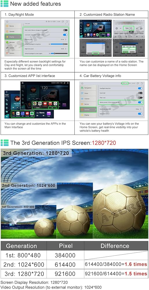 ترقية راديو السيارة Android: نظام Android للتخصيص، مع وحدة معالجة مركزية 8 النواة بسرعة 1.6 جيجا هرتز، وذاكرة وصول عشوائي 4 جيجا بايت، تضمن التشغيل السلس واستجابة أسرع، وذاكرة قراءة فقط 64 جيجا بايت لمزيد من التطبيقات المثبتة، وشاشة لمس عالية الدقة 1280*720 من الجيل الثالث IPS، وألوان أكثر ثراءً وعرضًا أكثر وضوحًا، دقة عرض الشاشة 1280 × 720، دقة إخراج الفيديو 1024 × 600 (للشاشة الخارجية)
