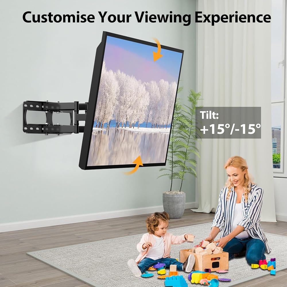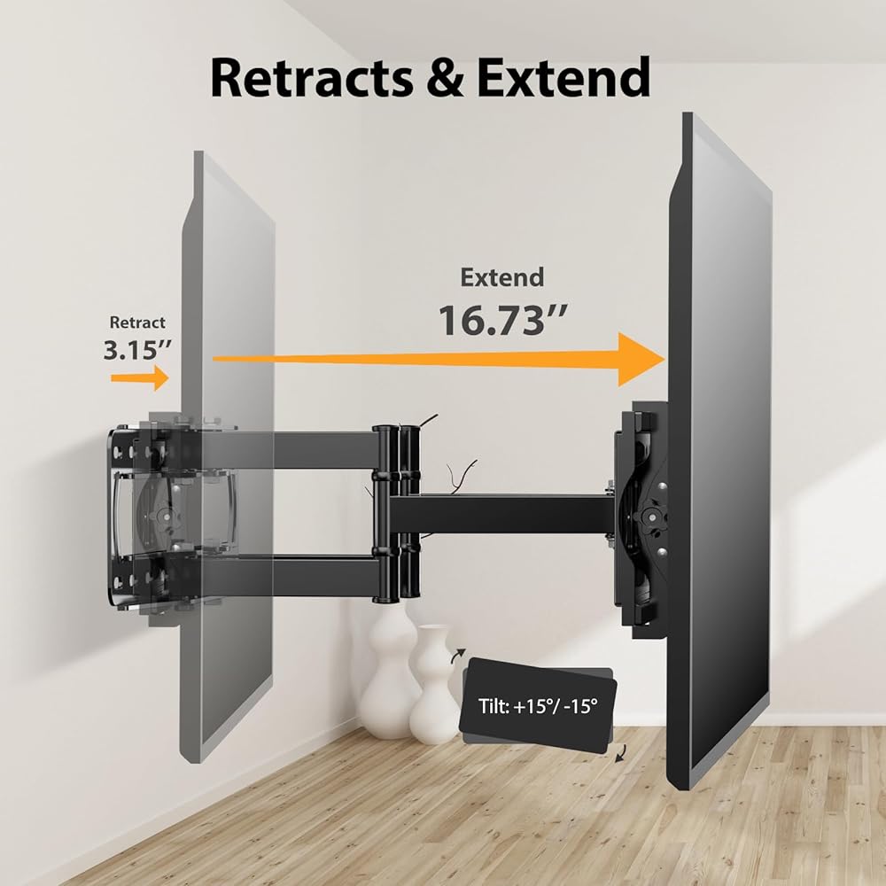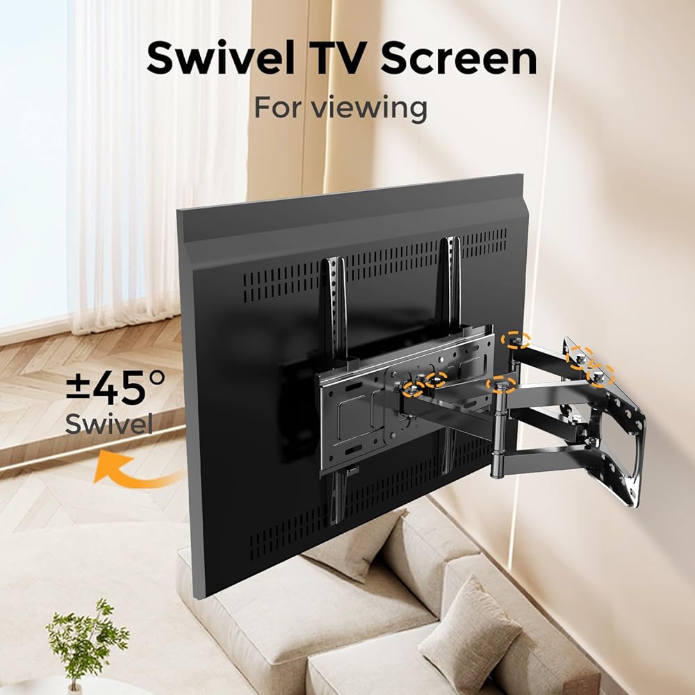 تعديل الحركة الكاملة: يشتمل حامل التلفزيون كامل الحركة هذا على +15 درجة/-15 درجة إمالة لتقليل الوهج، وتدوير 45 درجة يسارًا ويمينًا، مع أقصى قدر من مرونة العرض. كل هذا سيجعلك تجد وضع المشاهدة الأكثر راحة وصحة. (ملاحظة: الحد الأقصى لزاوية الدوران يعتمد على حجم الشاشة)