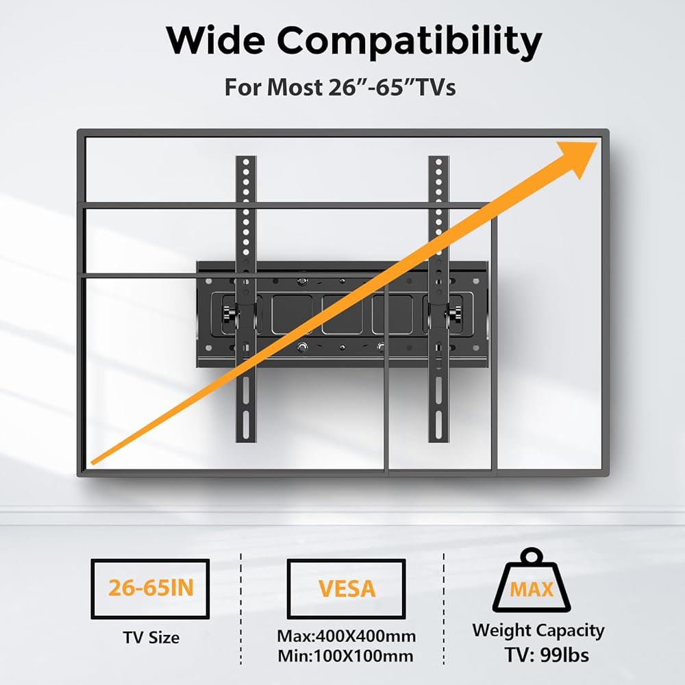 حامل حائط تلفزيون عالمي: حامل حائط تلفزيون كامل الحركة يناسب معظم أجهزة التلفاز مقاس 26 بوصة - 65 بوصة مع أنماط VESA من 100 × 100 مم إلى 400 × 400 مم. يرجى التحقق من الحجم والوزن ونمط VESA الخاص بالتلفزيون الخاص بك قبل الشراء.