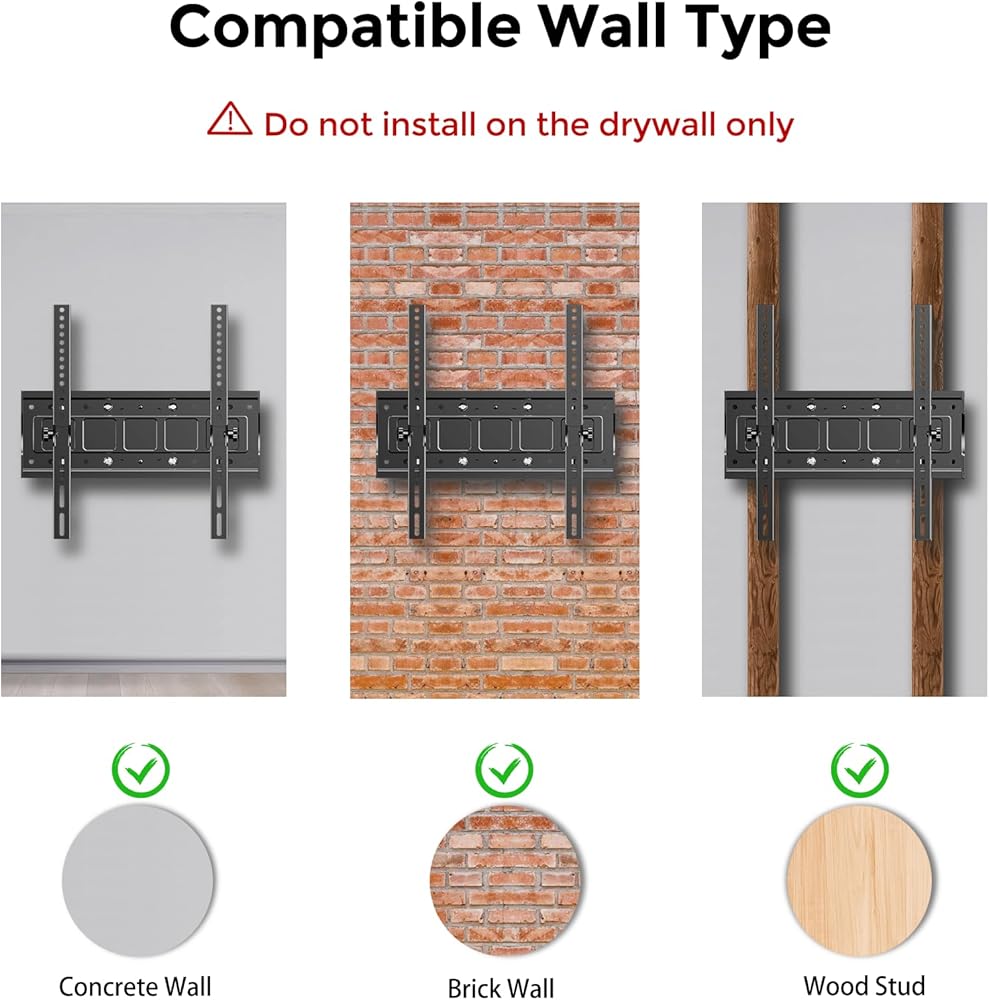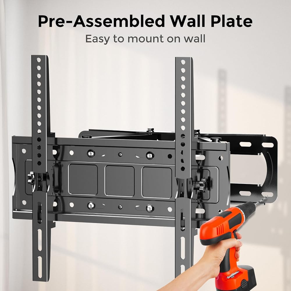 سهل التركيب: يأتي حامل التلفزيون على الحائط مع دليل تعليمات مفصل، وأدوات تثبيت، ولجعل التثبيت سهلاً قدر الإمكان. ببساطة قم بتوصيل الدعامات بالتليفزيون الخاص بك، ثم قم بتركيب مجموعة الذراع على الحائط (مسامير خشبية أو خرسانية أو طوب)، ثم قم بتعليق التلفاز الخاص بك. يرجى عدم التركيب على الجدار الجاف وحده.