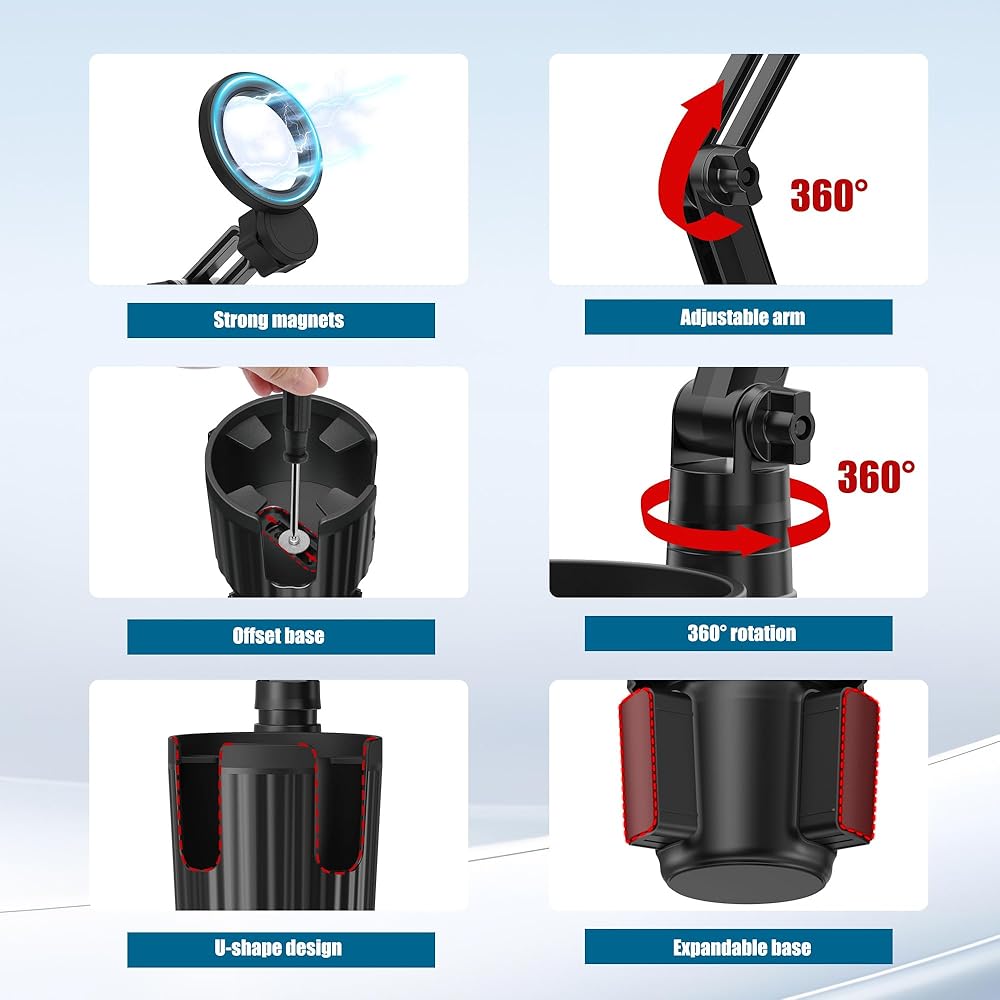 سهل الاستخدام بيد واحدة ورقبة تدور 360 درجة: إنه سهل وسريع الاستخدام مع حامل الهاتف المغناطيسي بيد واحدة، ويوفر قبضة آمنة لهاتفك تمامًا؛ يمكن لحامل الهاتف المغناطيسي للسيارة ذو الذراع وحامل الهاتف الخلوي أن يدور 360 درجة، كما أن ذراع دعامة تثبيت الهاتف في السيارة مجزأ، ويمكن تعديله على ارتفاعات وزوايا مختلفة. يمكن تثبيت قضيبين بإحكام عن طريق زر التعديل، لذلك لن يهتز حامل الهاتف حامل الأكواب أبدًا