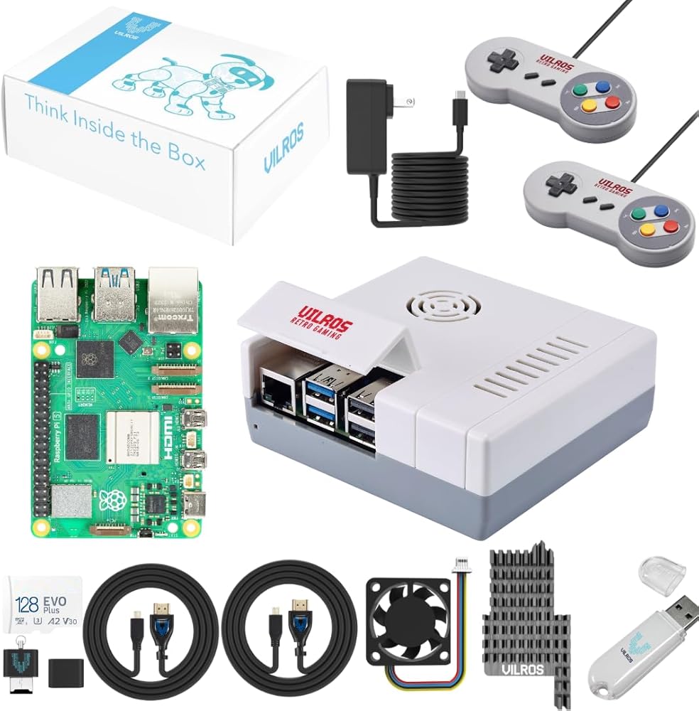Kit Content: Raspberry Pi 5 Board (Choose Capacity)---128GB Micro SD Card (Preloaded with RP OS)---Micro SD to USB Adapter (Can Be Used to write any desired gaming software onto the SD card)---Vilros Raspberry Pi 5 Compatible Power Supply ---2x Vilros HDMI-MICRO HDMI Cable---Vilros Raspberry Pi 5 Compatible Retro Gaming Style Case With internal fan--2x Vilros Retro Gaming Style Gamepads--Vilros 8GB Flash Drive--Vilros Extreme Heat Sink for Raspberry Pi 5