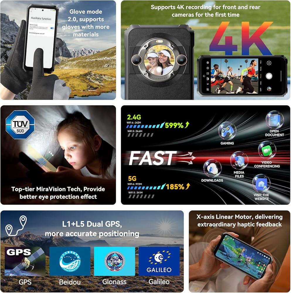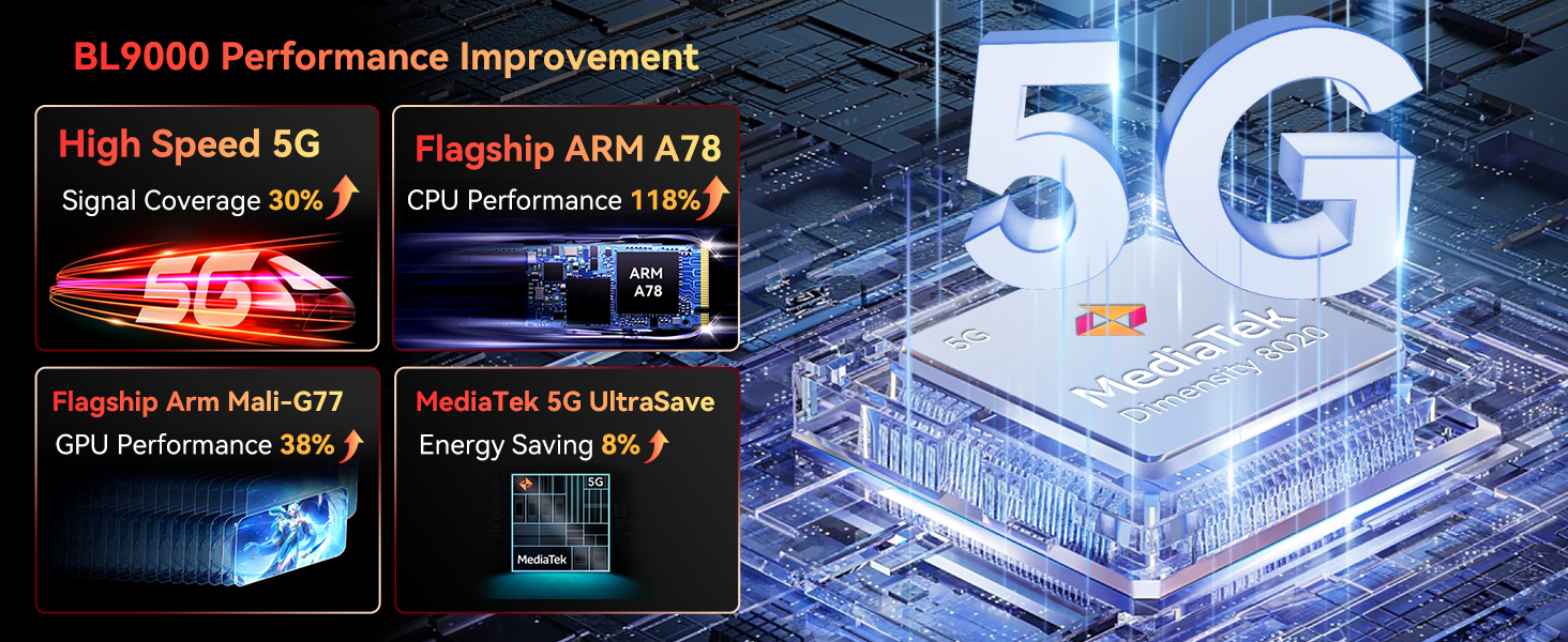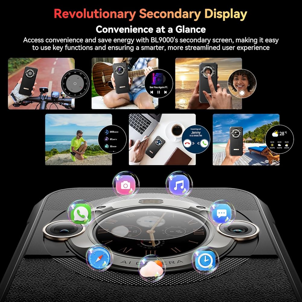 Blackview BL9000 5G هاتف ذكي متين 24 جيجابايت + 512 جيجابايت، 6.78 بوصة 2.4 كيلو 120 هرتز هاتف متين + شاشة خلفية 1.32 بوصة، شحن 120 وات/8800 مللي أمبير، كاميرا مزدوجة 50 ميجابكسل، شريحة 5G الأبعاد 8020، أندرويد 13، بصمة الإصبع/معرف الوجه/NFC