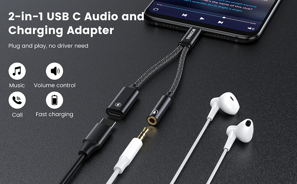 【محول USB C إلى 3.5 مم 2 في 1】مع محول شاحن الصوت USB C إلى 3.5 مم، يمكنك الاستماع إلى الموسيقى الخاصة بك أثناء شحن هاتفك، هذا المحول متعدد الوظائف USB من النوع C إلى 3.5 مم يدعم تشغيل الموسيقى والمكالمات لمعظم الأشخاص. أجهزة USB C، وتدعم التحكم في مستوى الصوت أثناء الشحن السريع لجهازك. ملاحظة: لا يدعم نقل البيانات.