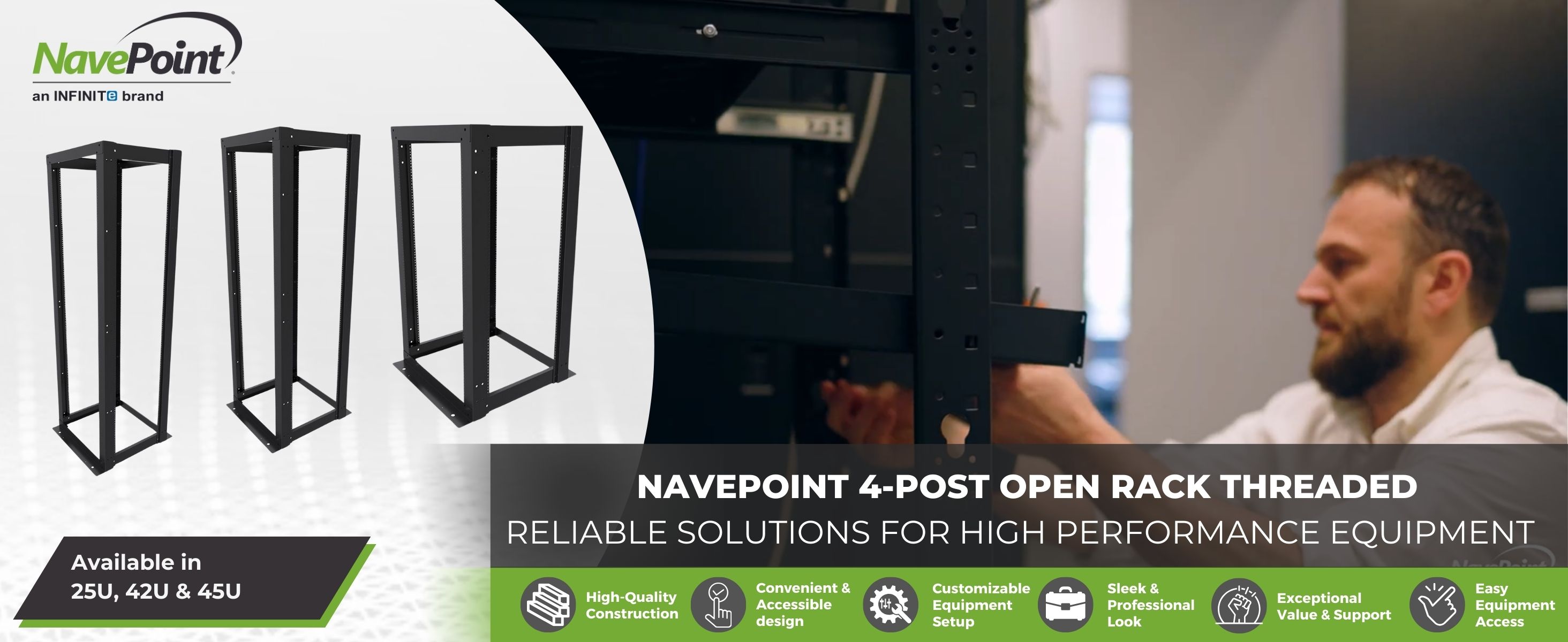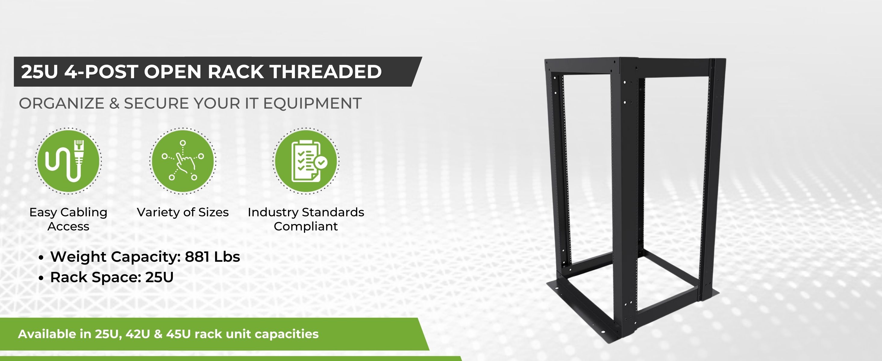 المواصفات - تم تصميم رف الإطار المفتوح بعرض 23 بوصة NavePoint 25U ذو 4 أعمدة للاستخدام القوي في مراكز البيانات ومرافق الاتصالات. تبلغ أبعادها 23 بوصة عرضًا × 24 بوصة عمقًا × 49 بوصة ارتفاعًا، وهي مثالية لاستضافة مجموعة متنوعة من معدات الشبكات والاتصالات في الإعدادات الاحترافية الصعبة.