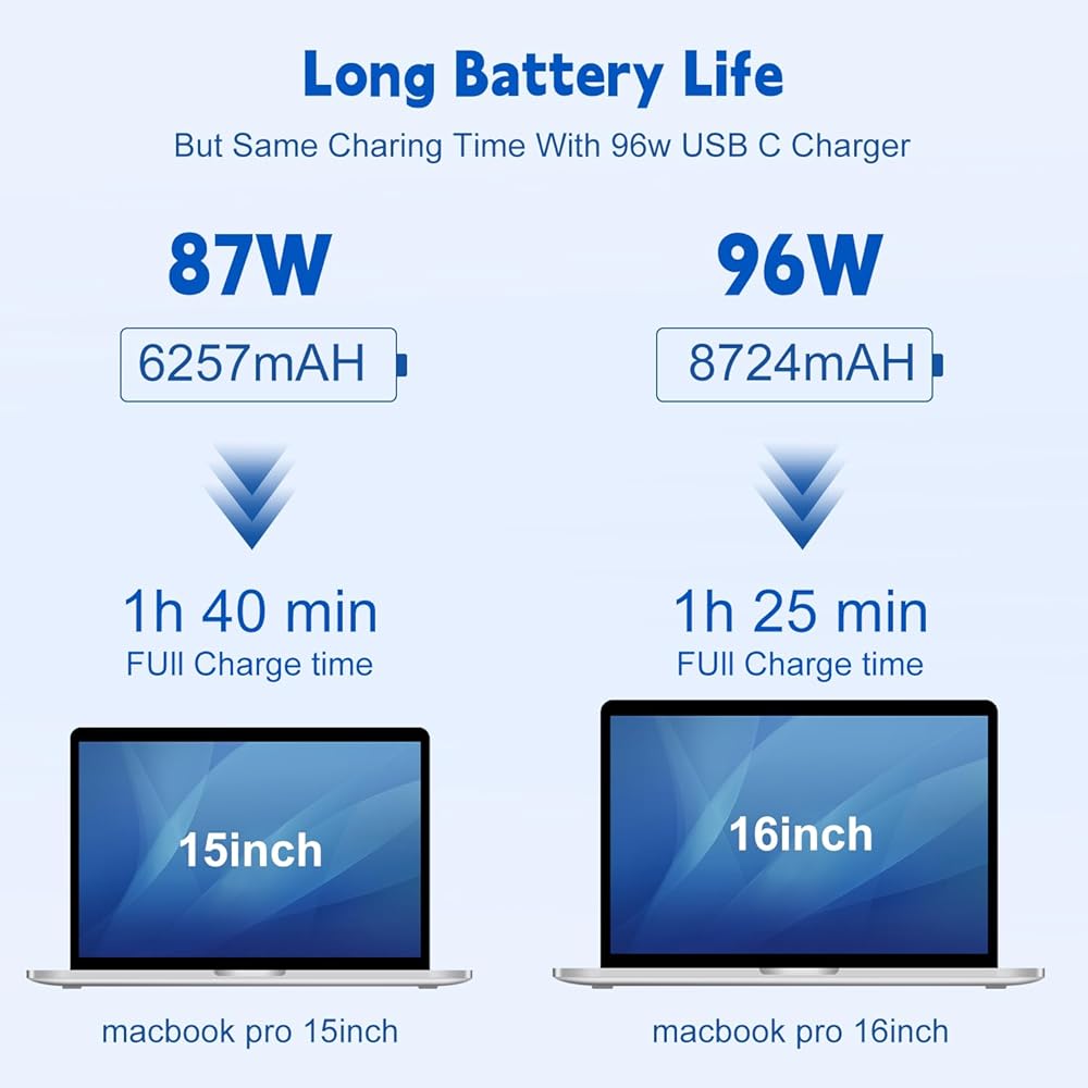 شاحن USB C بقدرة 96 وات لجهاز MacBook Pro 16، 15، 14، 13 بوصة 2024، 2023، 2022، 2021، M3 M2 M1 MacBook Air، جميع أجهزة USB C، متضمنة كابل USB-C إلى C بطول 6.6 أقدام