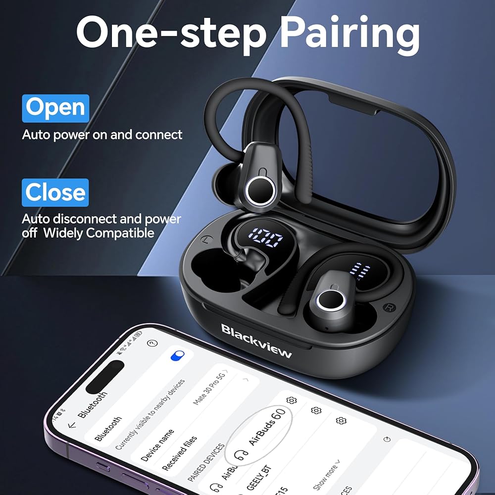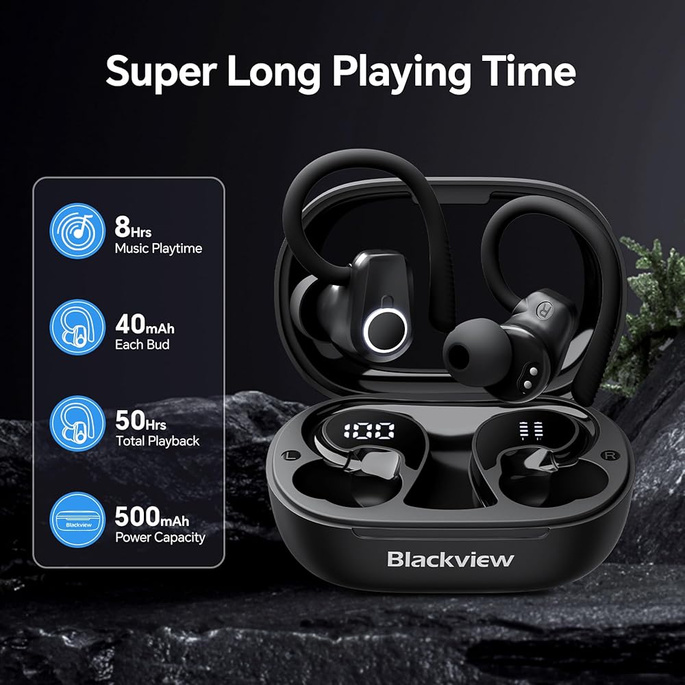 سماعات أذن بلوتوث لاسلكية رياضية من بلاك فيو، سماعات أذن بلوتوث 5.3 مع خاصية إلغاء الضوضاء، وقت تشغيل 50 ساعة، أجهزة استشعار تعمل باللمس، شاشة LED مزدوجة، سماعات أذن لاسلكية للجري