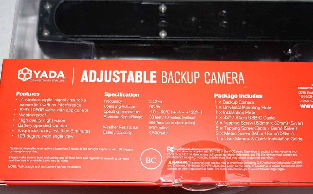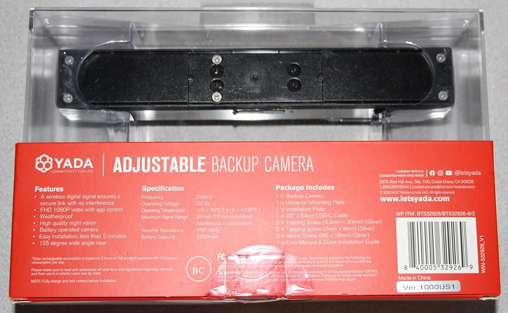 The YADA App View Wireless Solar-Powered Adjustable Backup Camera combines the power of technology and the sun. This system has a built-in lithium-ion battery that recharges through the solar panel. Utilizing a 2.4Ghz digital signal, the camera transmits a 720P rearview video image to the smartphone and YADA Drive app without interference. The wire-free installation and mounting process couldn't be easier. You can even ask Siri to "Open YADA Drive app" when it's time to reverse. Enhance your drive, today.