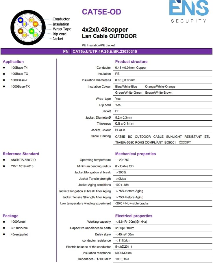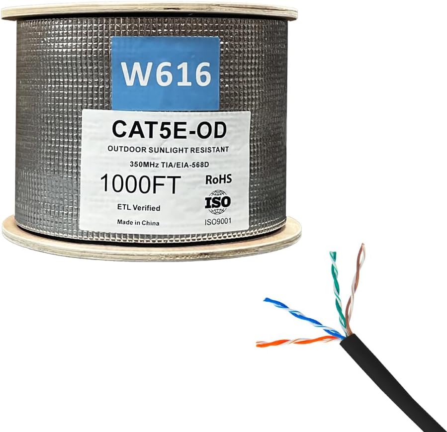 ENS Vertical Cable Cat5e, 1000ft, UTP, UV Jacket, Outdoor Rated, CMX with Messenger, Black - Bulk Ethernet Cable on Wooden SpoolExpand your network infrastructure with the robust ENS Vertical Cable Cat5e, tailored for exceptional outdoor performance. This 1000-foot bulk Ethernet cable is designed with a UV-resistant jacket to withstand harmful sun exposure and is perfect for outdoor applications. Certified with an outdoor CMX rating and featuring a supportive messenger wire, it ensures secure aerial installations. The cable is built with unshielded twisted pairs (UTP) and is capable of supporting up to 350 Mhz, ideal for high-speed data communication. Packaged on a convenient wooden spool, this Cat5e cable is ETL Verified, meets TIA/EIA-568C standards, and is ROHS compliant, ensuring it meets high environmental and safety standards. Its clear waterproof layer and solid bare copper conductors provide additional protection and superior conductivity, making it an optimal choice for demanding outdoor conditions.