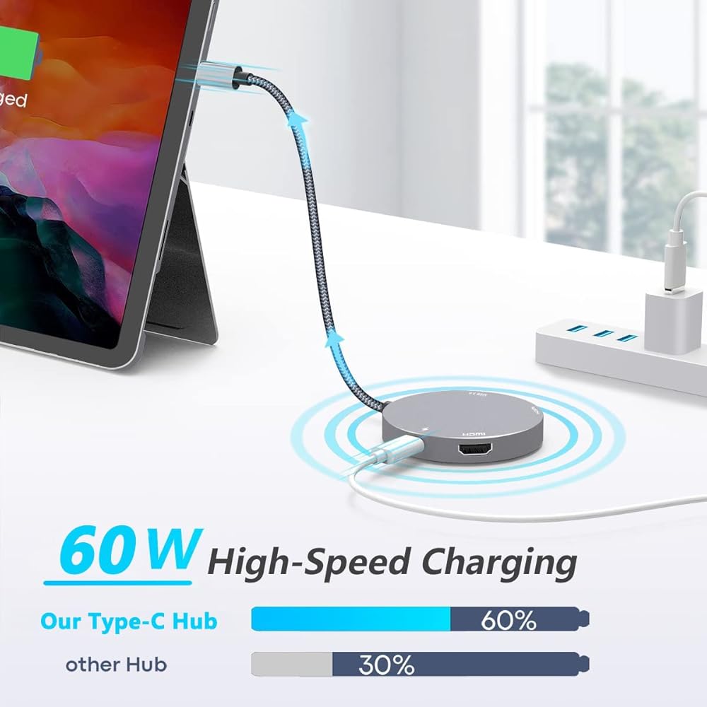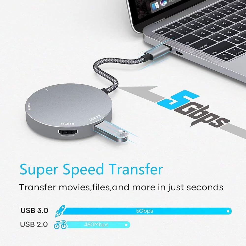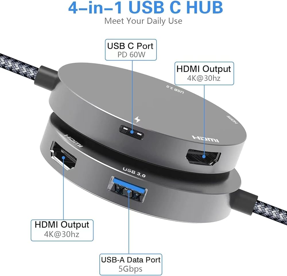 محول HDMI مزدوج متعدد الوظائف: يدعم منفذ USB من النوع C الخاص بنا hdmi إلى محور usbc أيضًا الشحن السريع بقدرة 60 وات PD، ويمكن لمنفذ USB Type-A 3.0 نقل البيانات بسرعة تصل إلى 5 جيجابت في الثانية، وهو USBc 4 في 1 المحور (2x HDMI، 1x USB-C، 1x USB A).